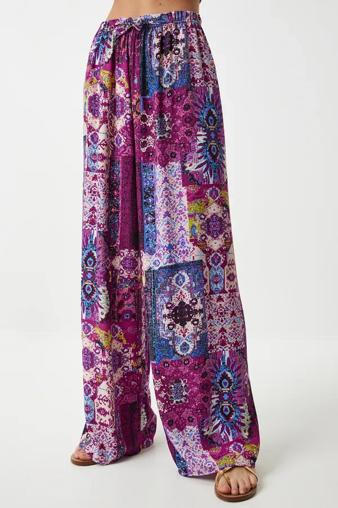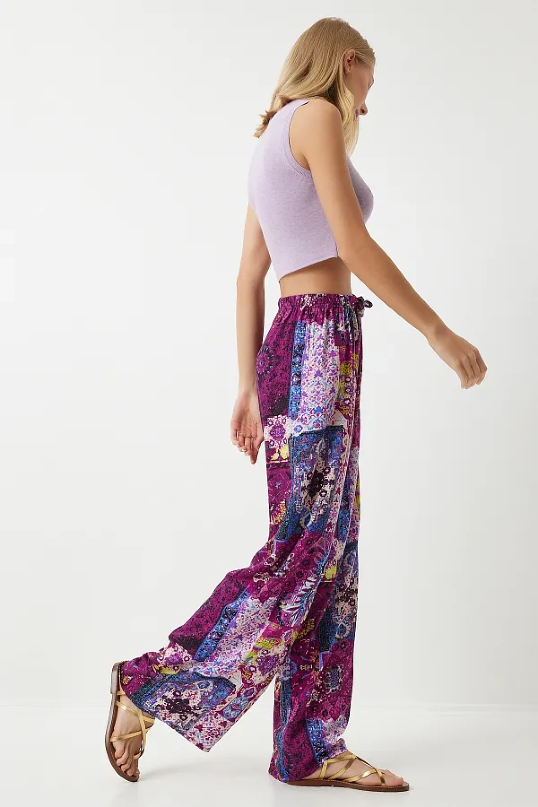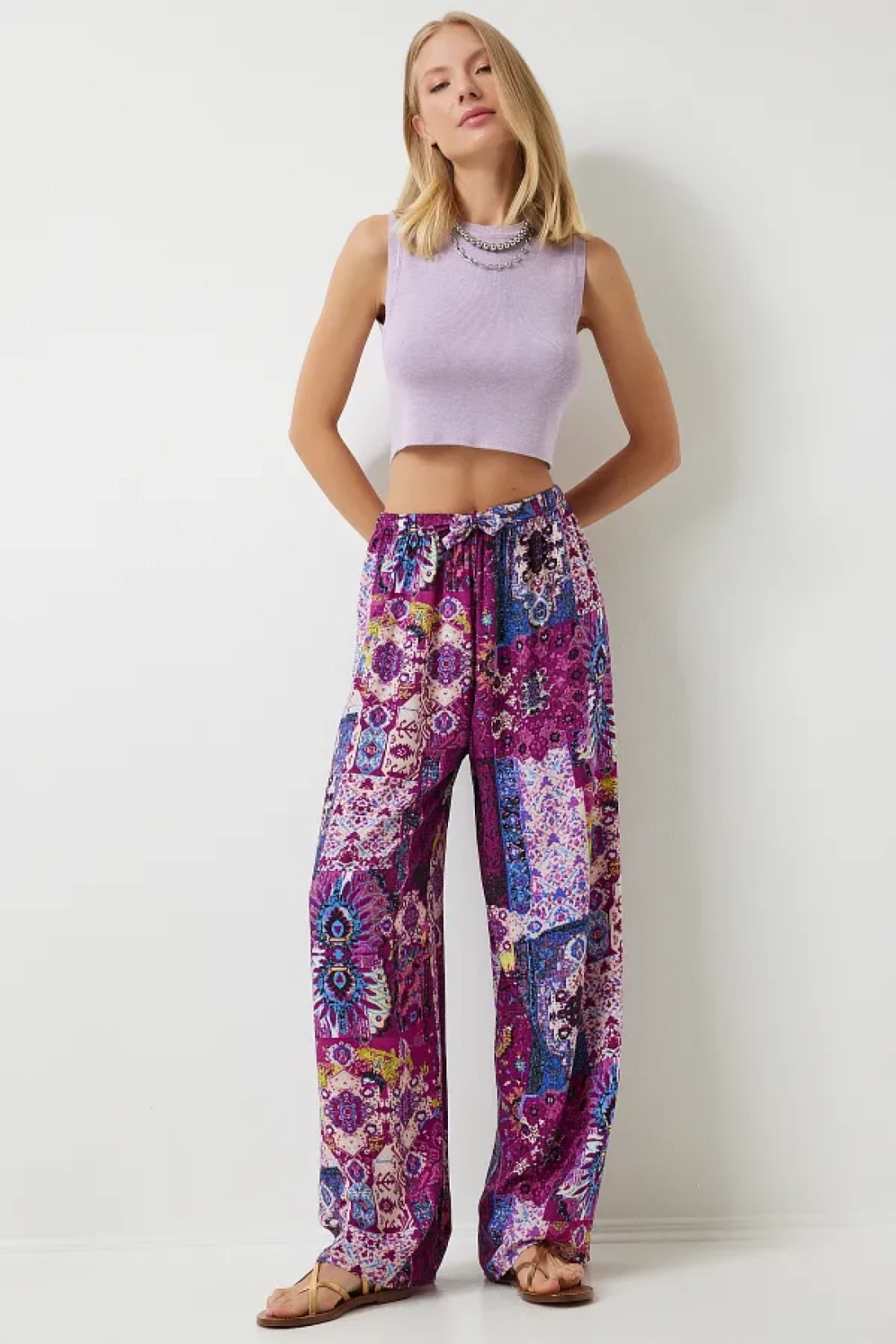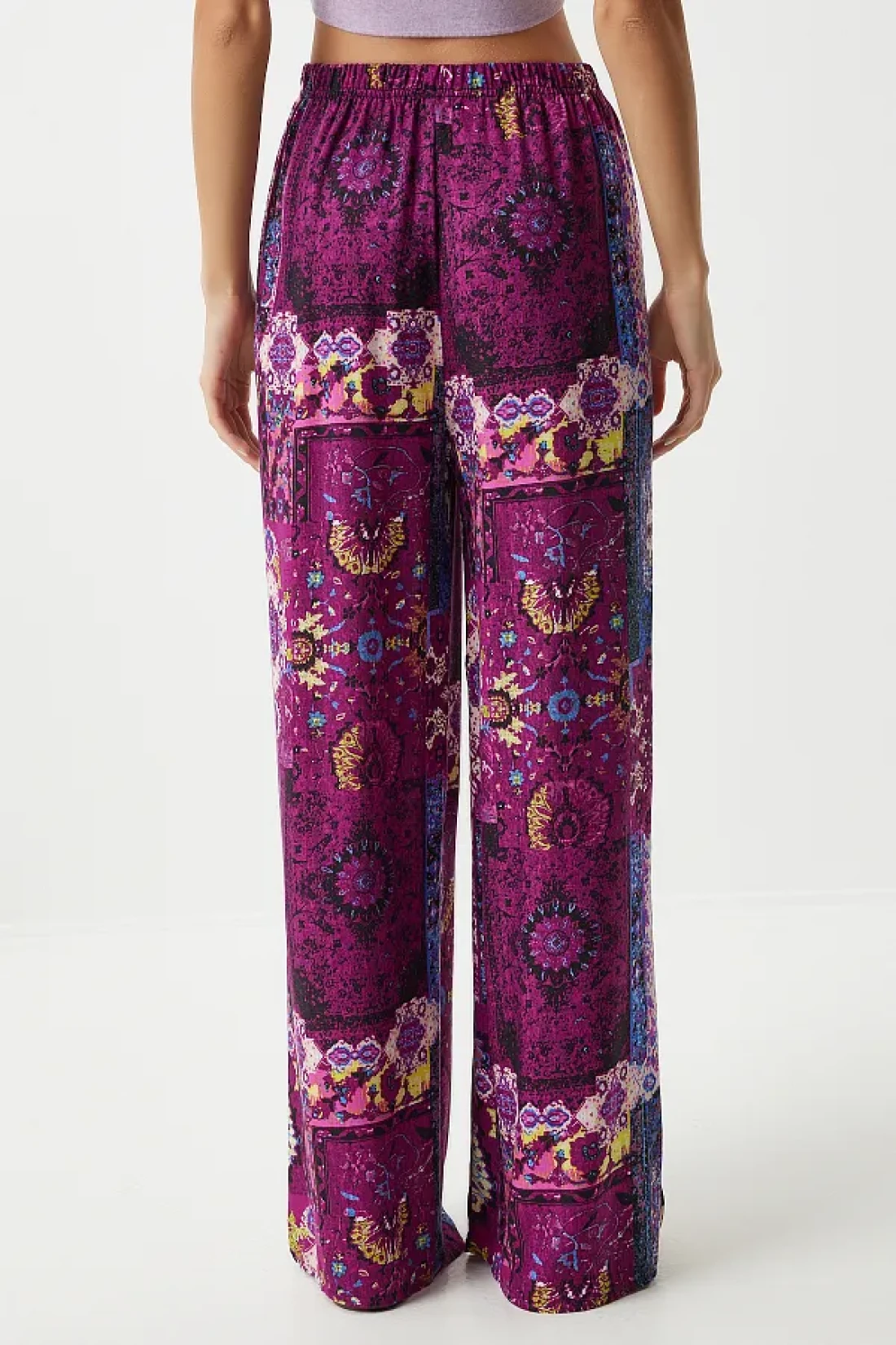 Happiness İstanbul بنطلون نسائي من الفسكوز بالازو منقوش باللون البرقوق إكرو EN00606