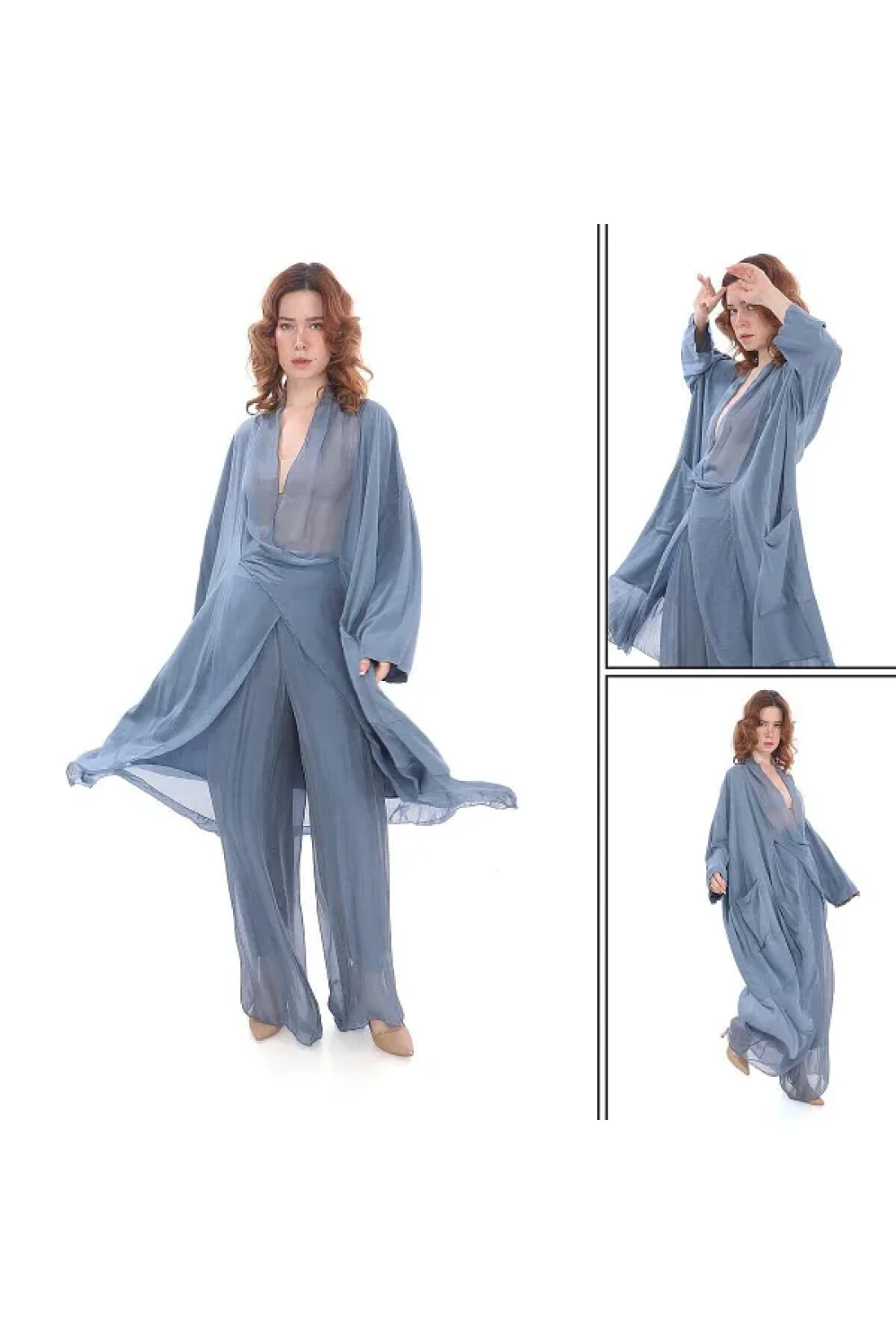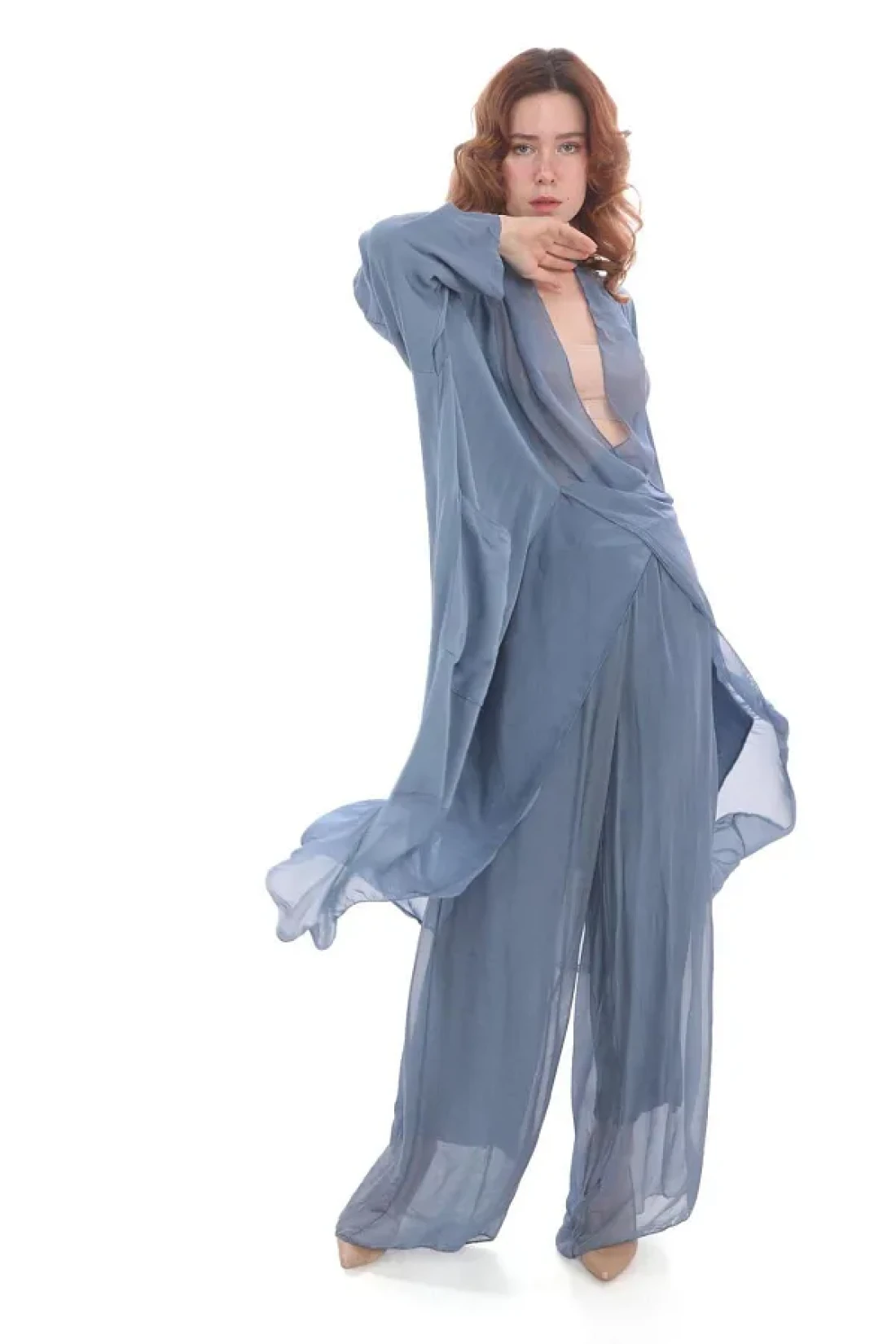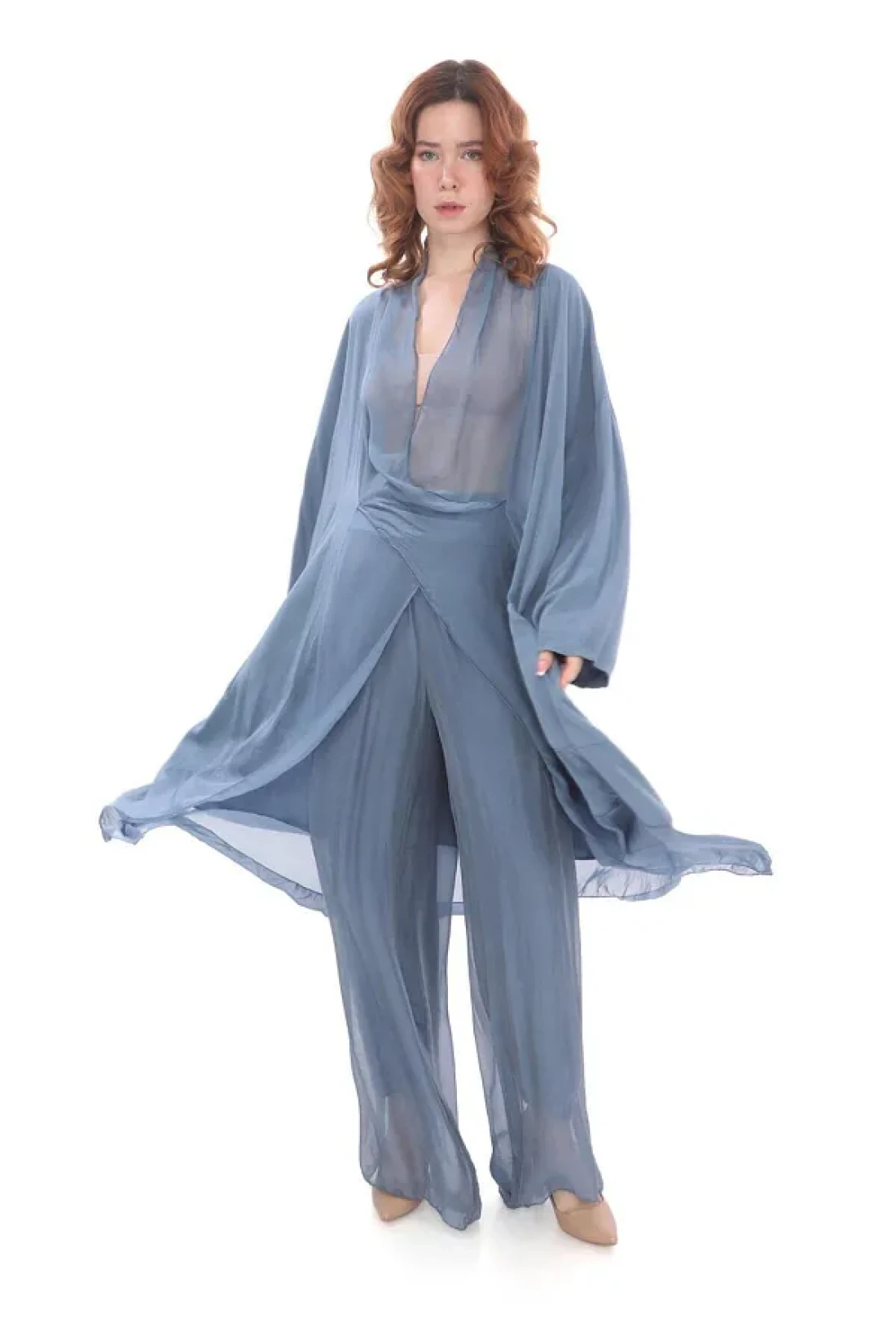 Bohem Stil بلوزة كاب كبيرة الحجم بتفاصيل حريرية إيطالية - طقم بنطلون ويس