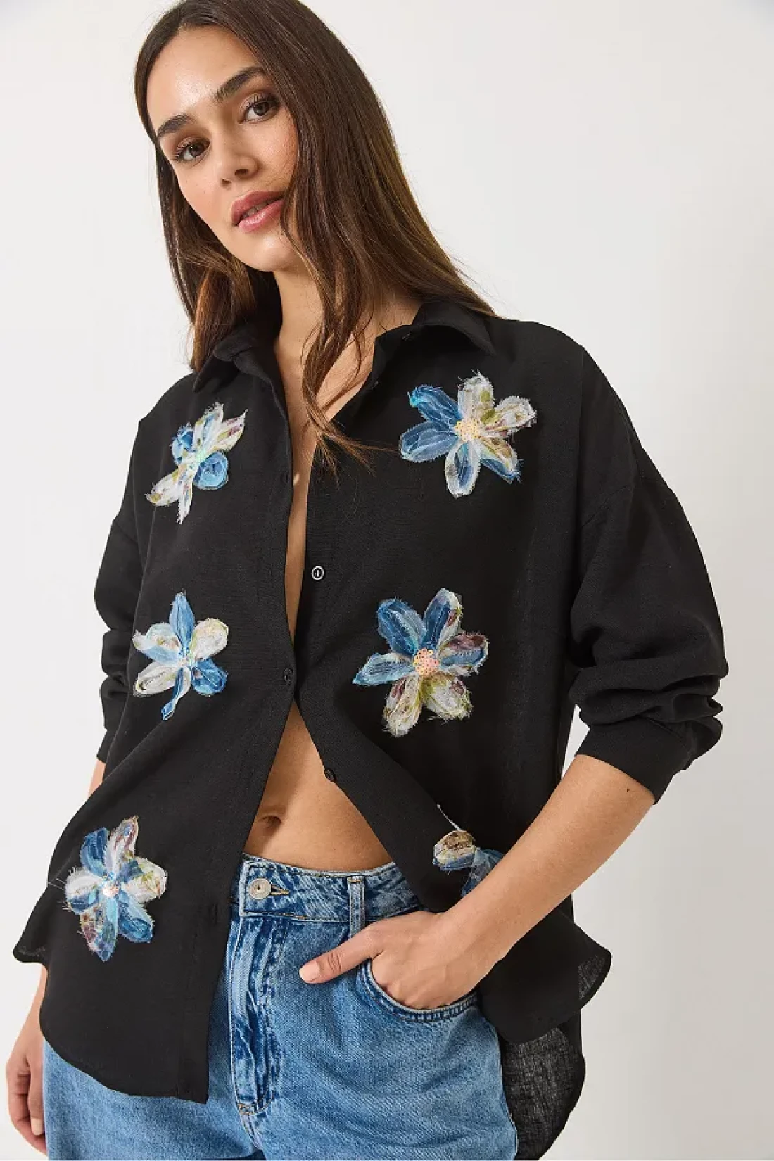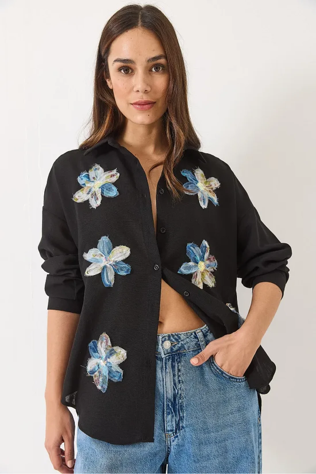Bianco Lucci قميص نسائي قطني بأكمام طويلة من التول مع إكسسوارات زهور 6526 60283057