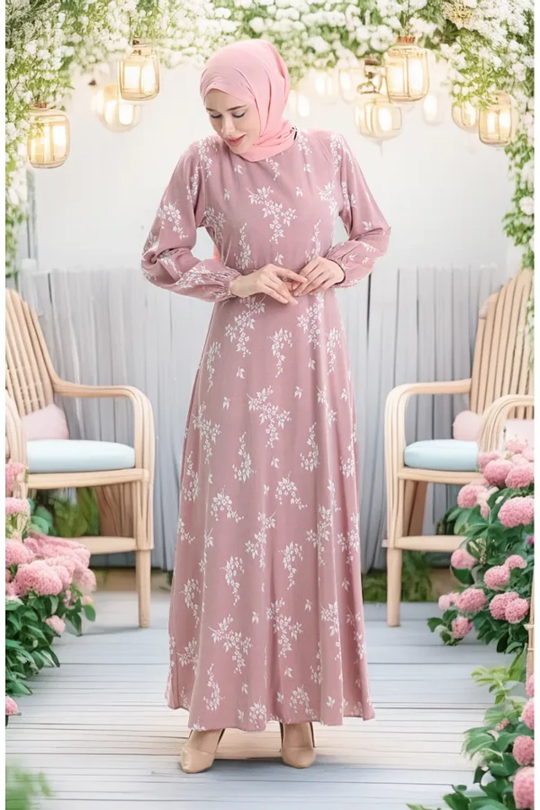 sefamerve فستان منقوش بأكمام مطاطية 2047-01 مسحوق