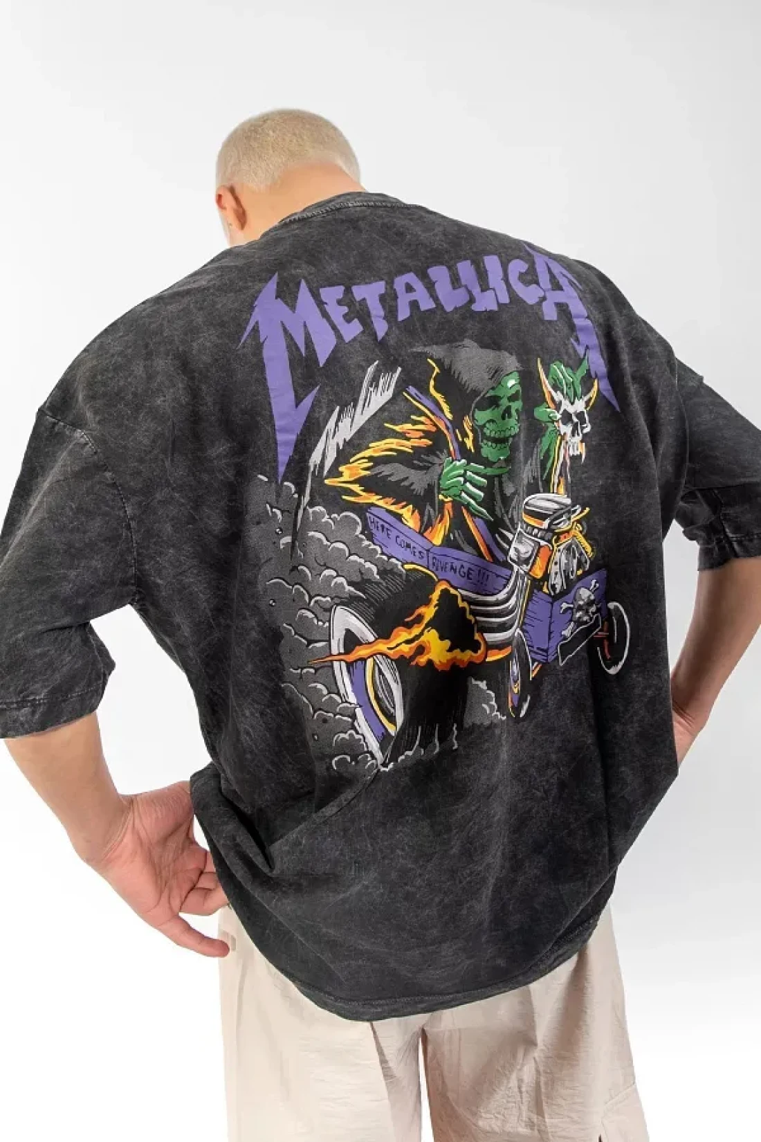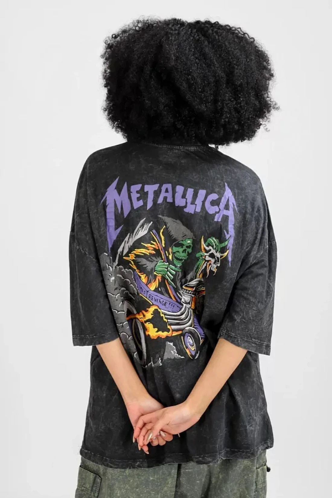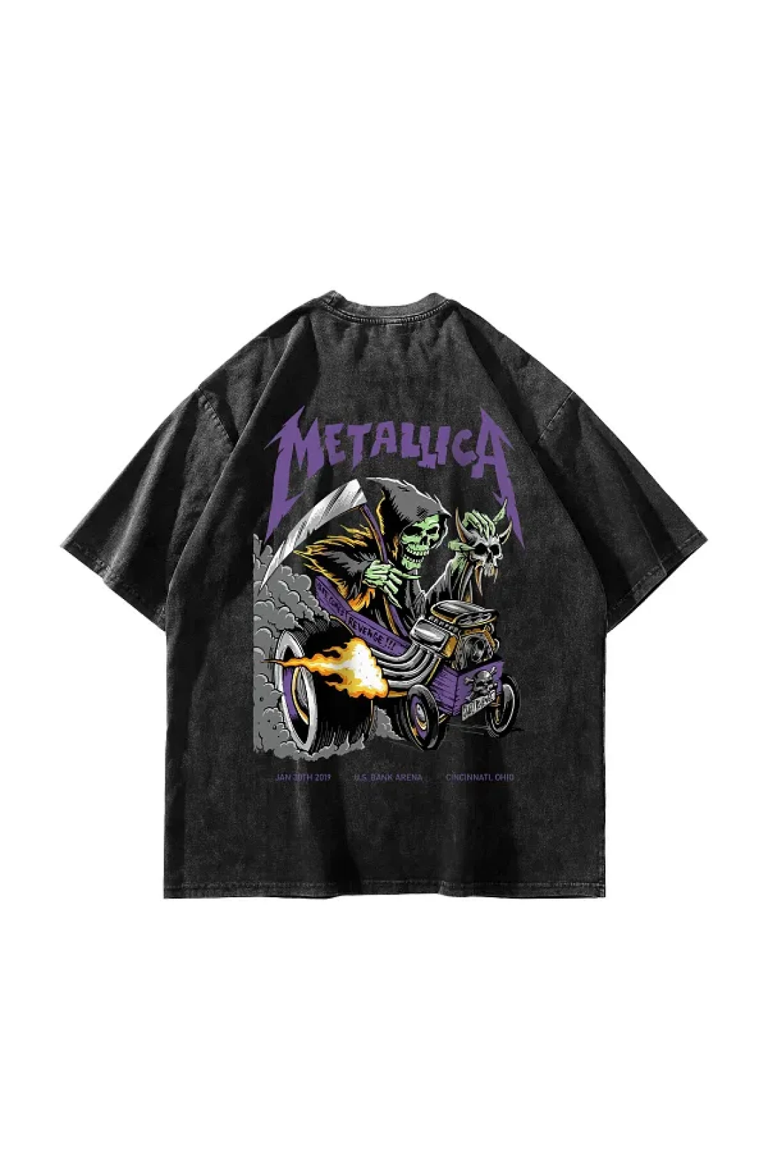 Sokak Butik تيشيرت ميتاليكا أرجواني مطبوع من الخلف باللون الأسود للجنسين مقاس كبير