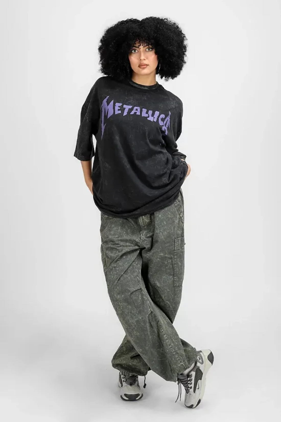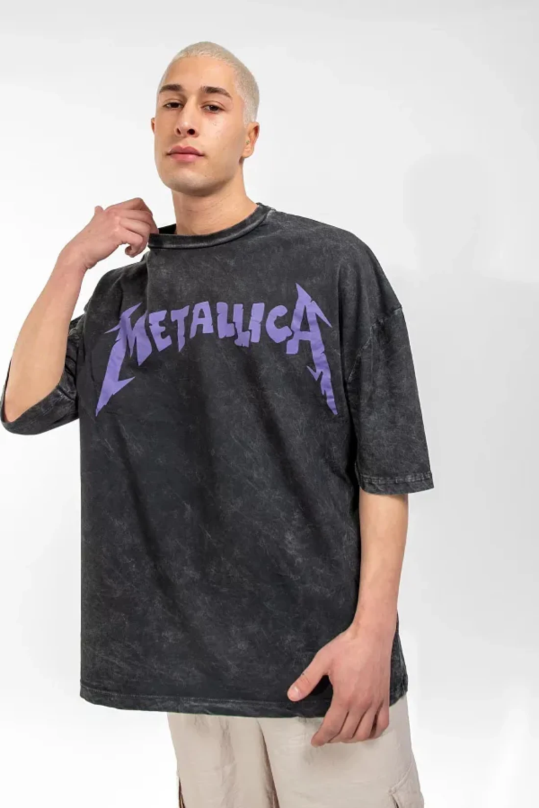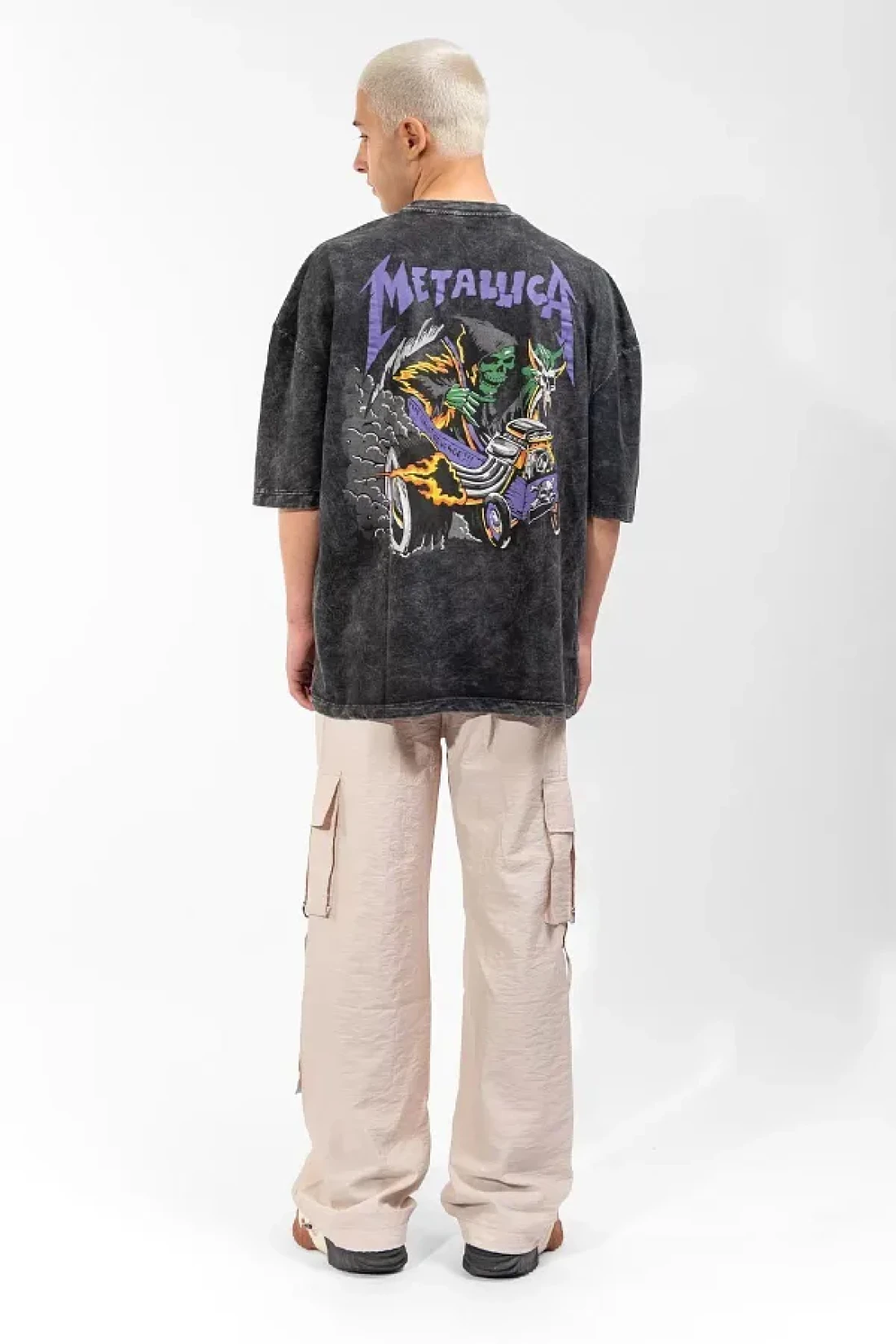 Sokak Butik تيشيرت ميتاليكا أرجواني مطبوع من الخلف باللون الأسود للجنسين مقاس كبير
