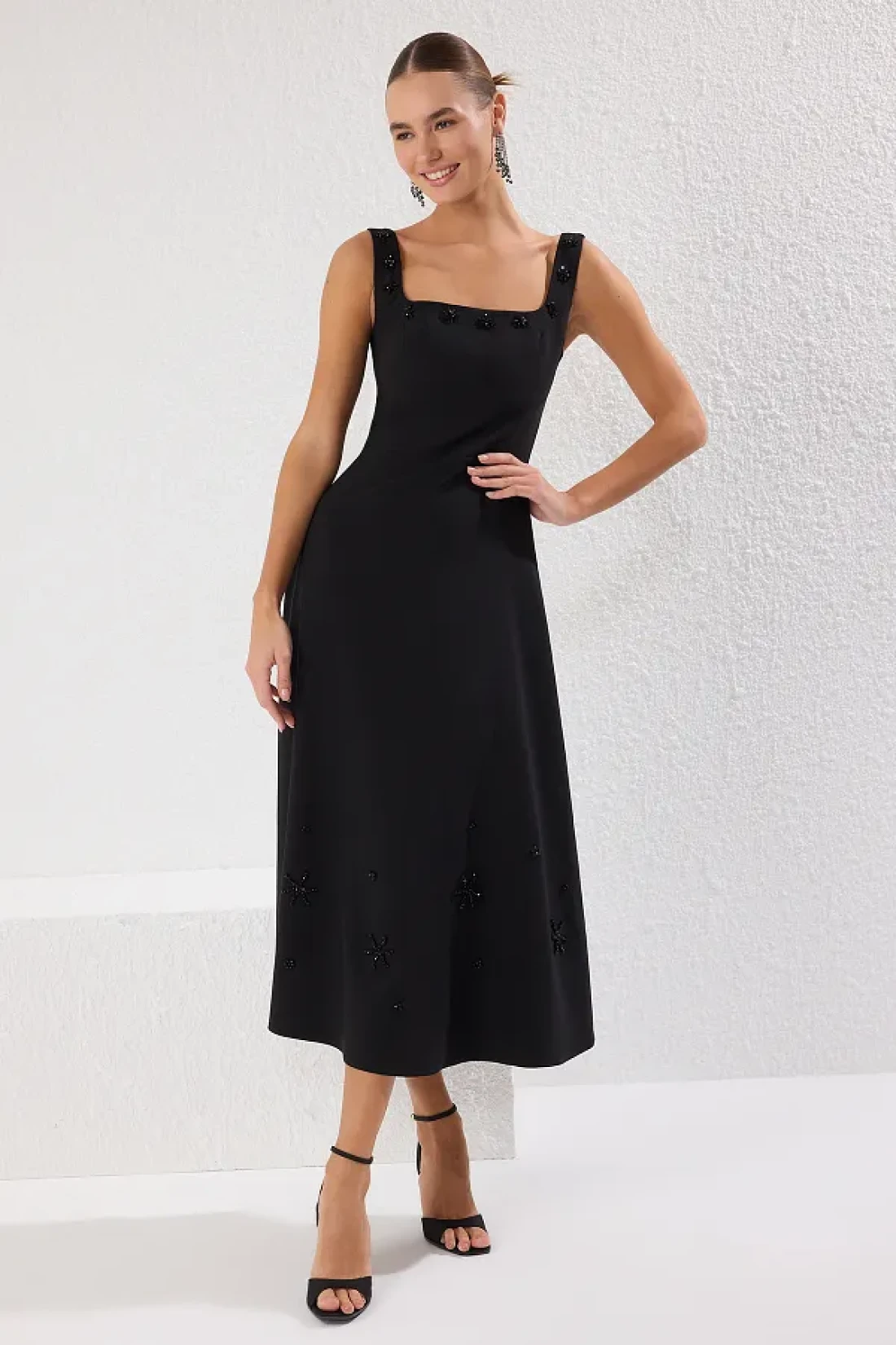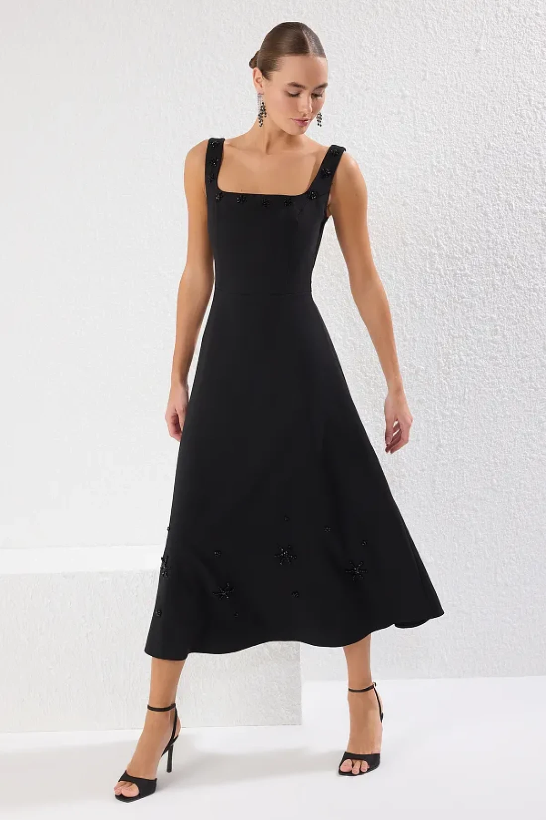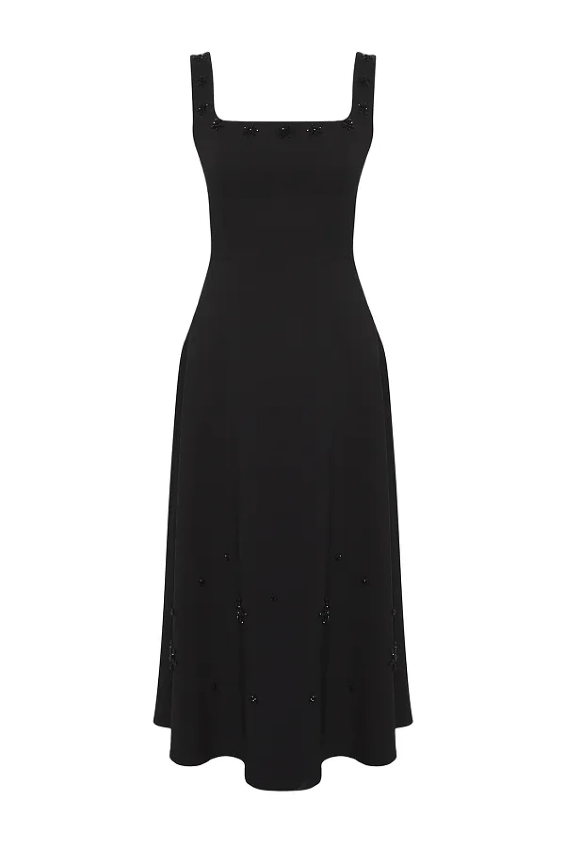 Collection فستان أسود مستقيم على شكل حرف A مزين بالأحجار المنسوجة فستان متوسط الطول غير مبطن أنيق/مساء