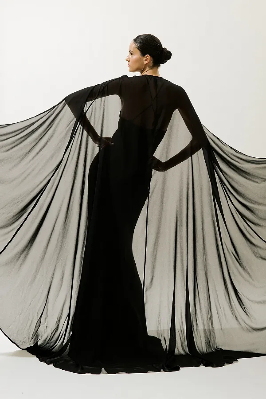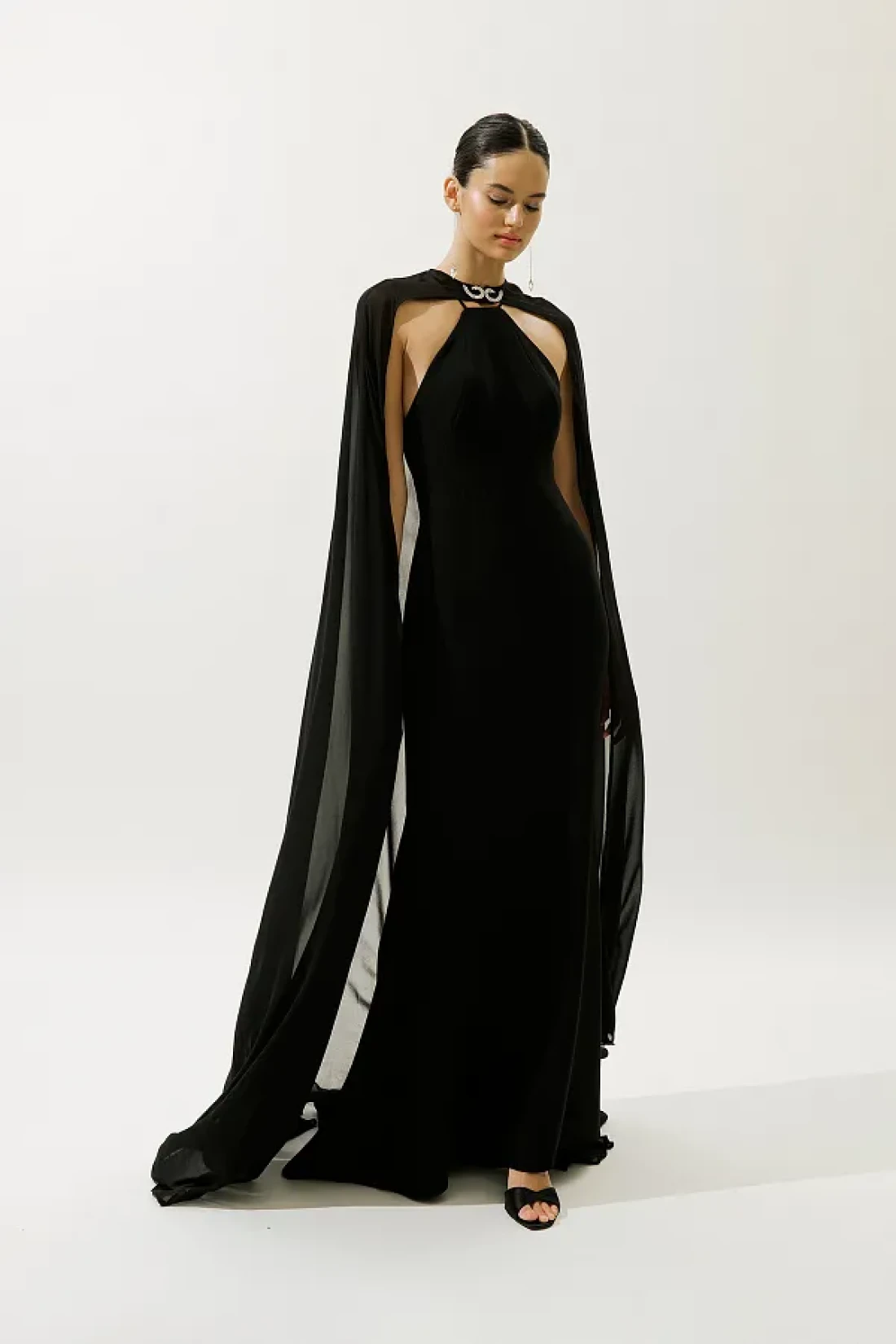 رقبة رسن، سحاب إغلاق، أشرطة، عباءة يمكن ارتداؤها وخلعها، تفاصيل إكسسوار على الظهر الخلفي، مبطنة، مع عباءة وذيل. النسيج الرئيسي: 100% بوليستر، البطانة 100% بوليستر، نسيج الغطاء 100% بوليستر. يُكوى على درجة حرارة منخفضة. لا تستخدم المبيض.