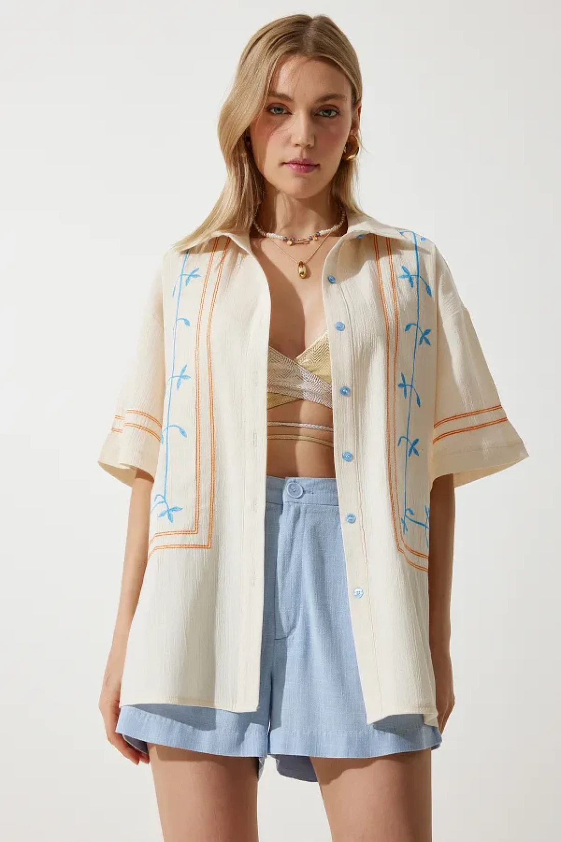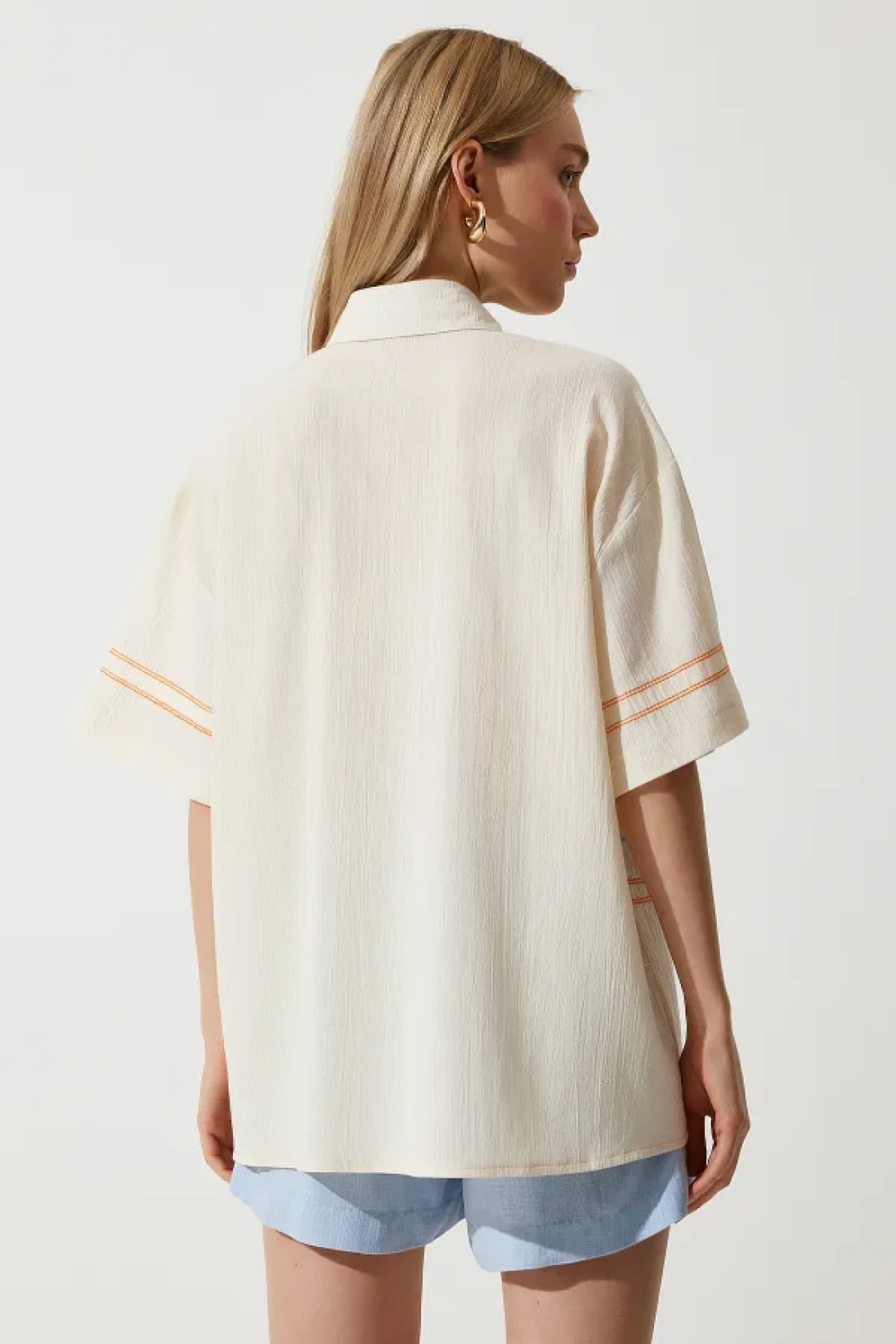Happiness İstanbul قميص نسائي من الكتان المطرز باللون الكريمي RG00039