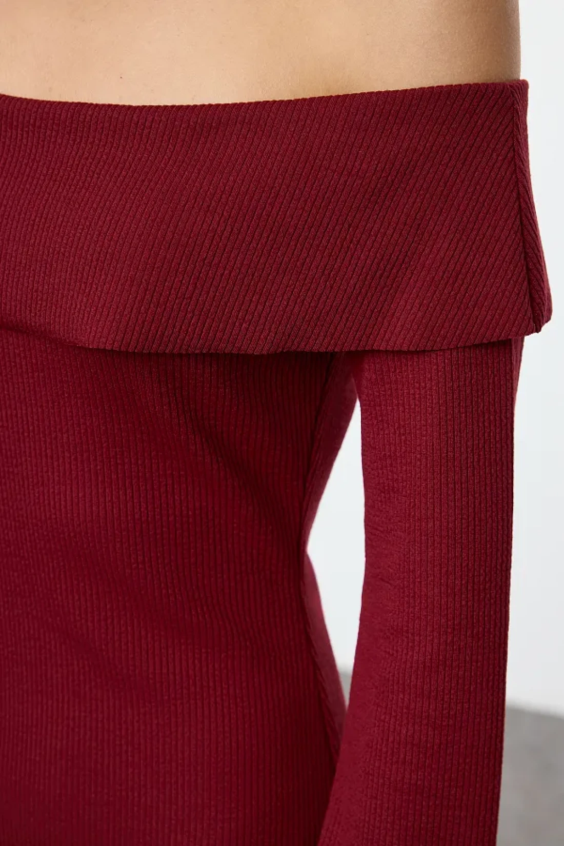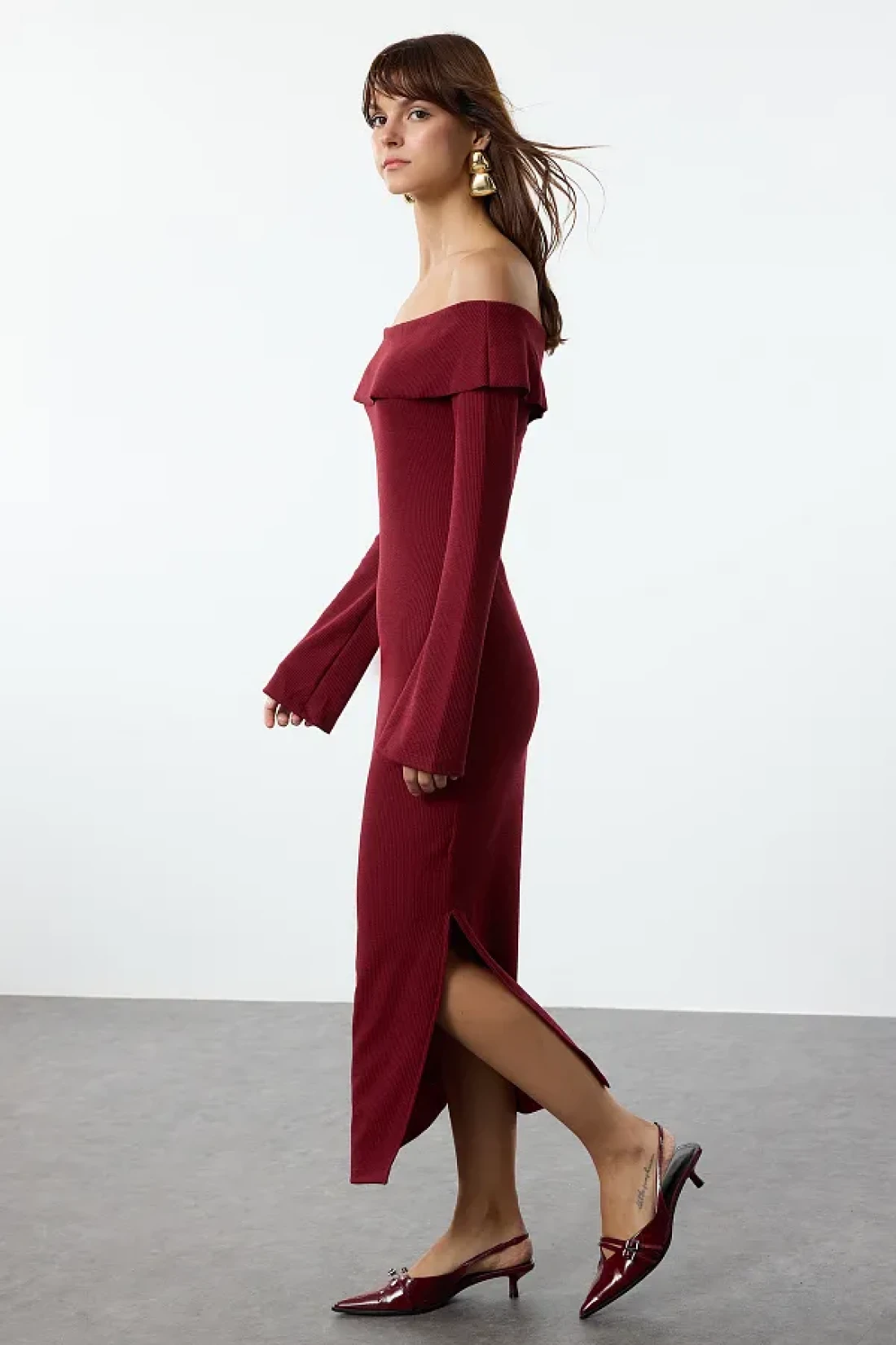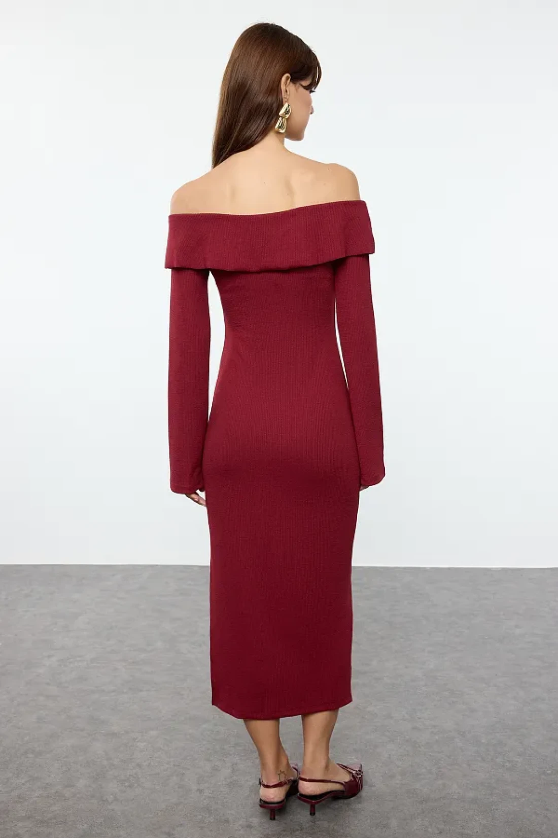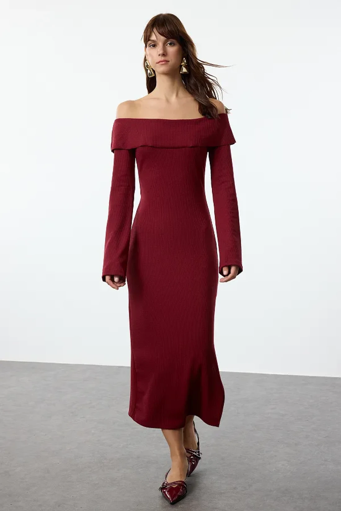 Collection فستان رصاص متوسط الطول بياقة كارمن باللون العنابي المرن والناعم - TWOAW24EL00803