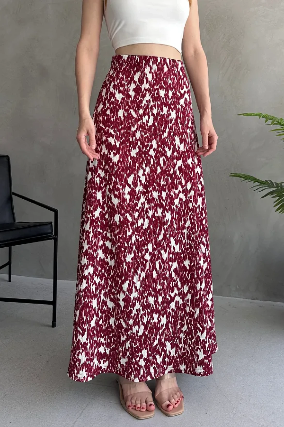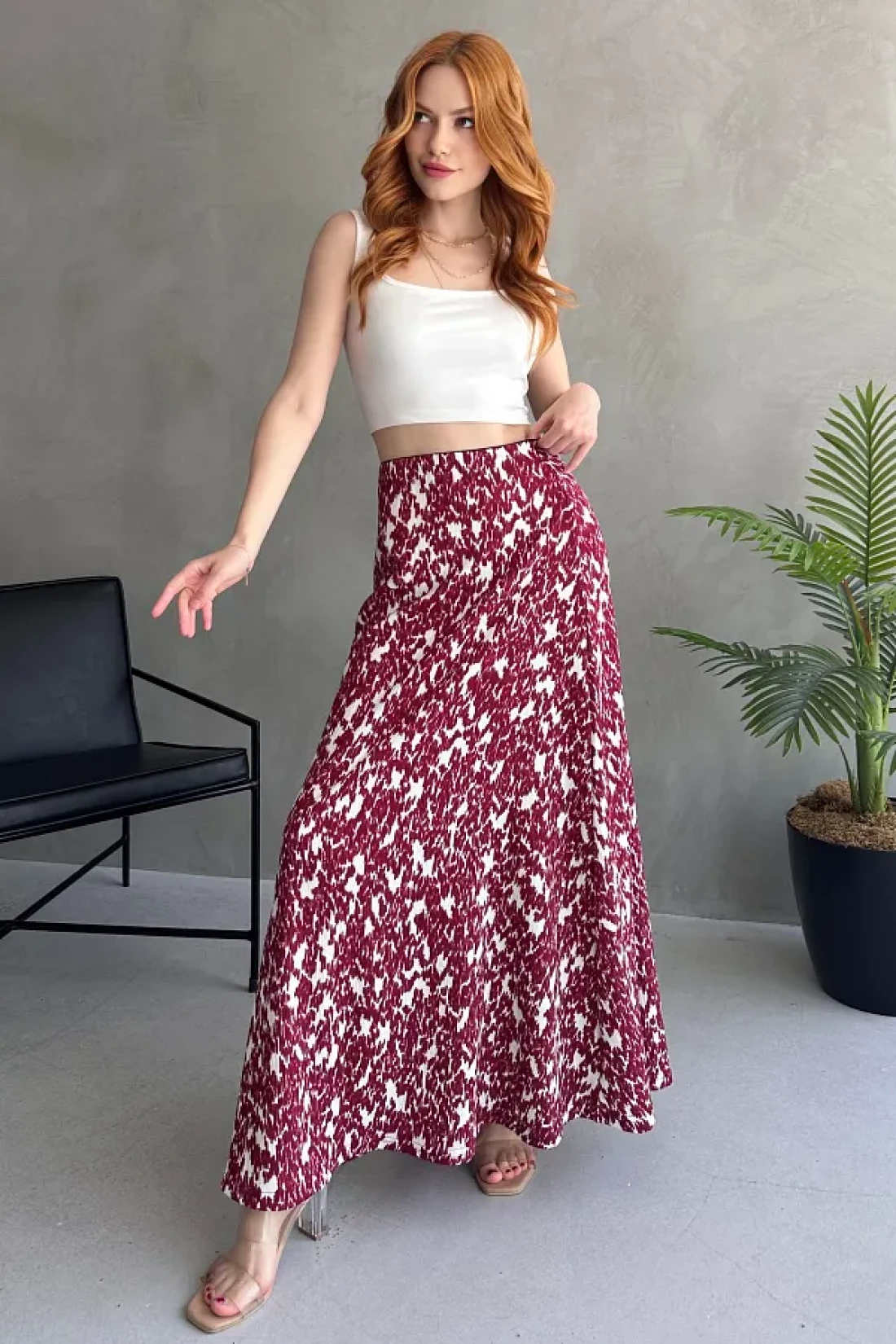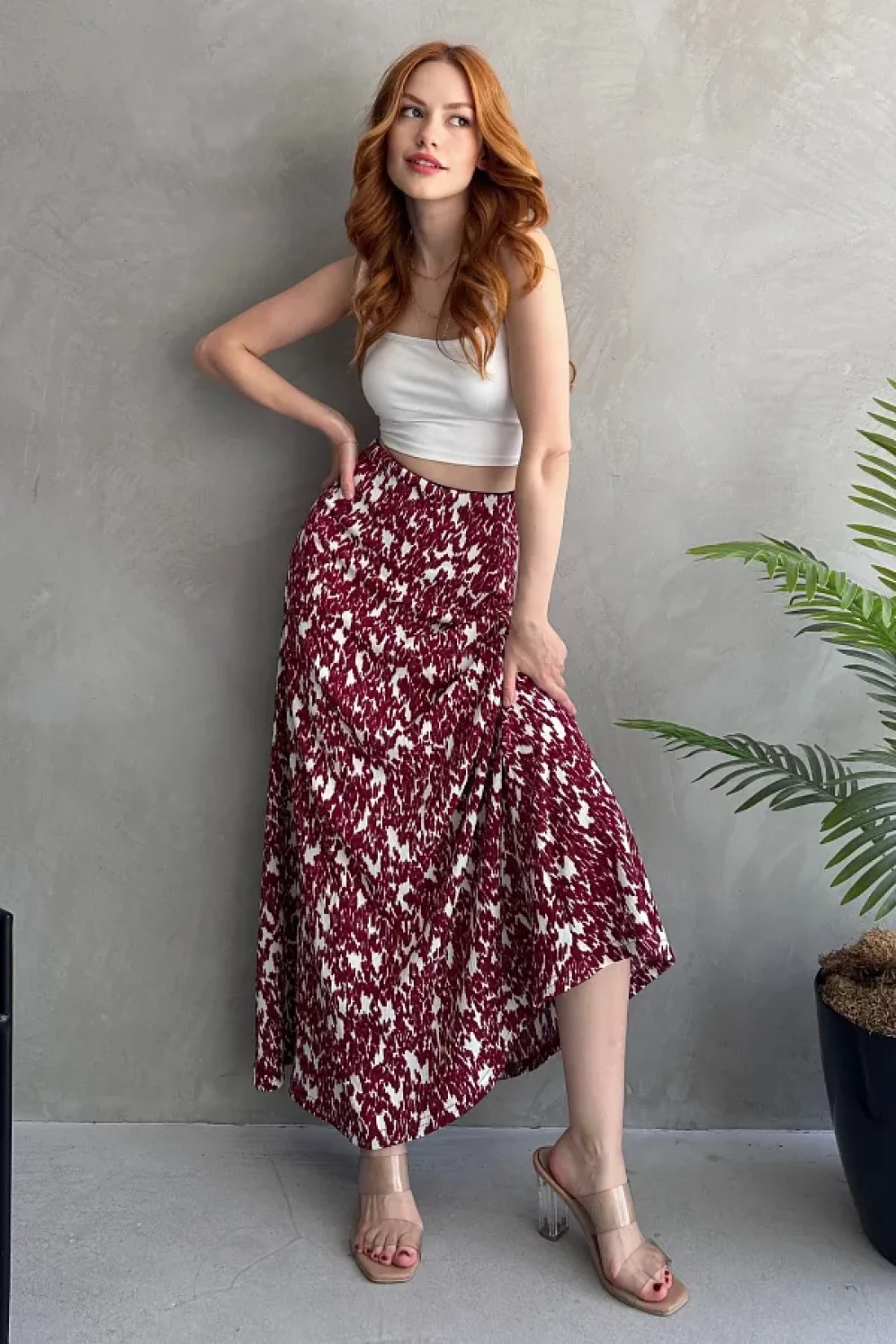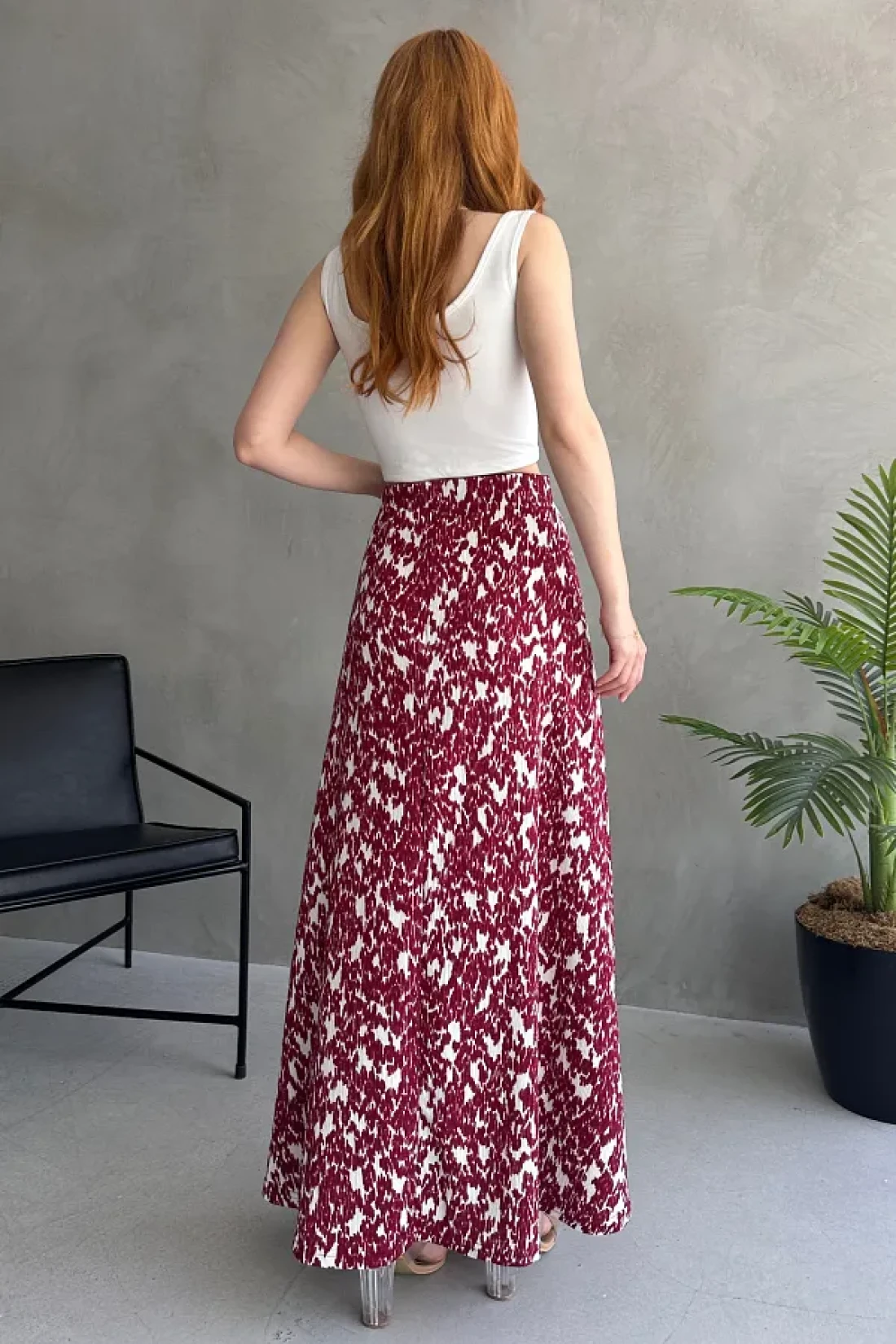 EYLANA تنورة طويلة منقوشة باللون الأبيض العنابي
