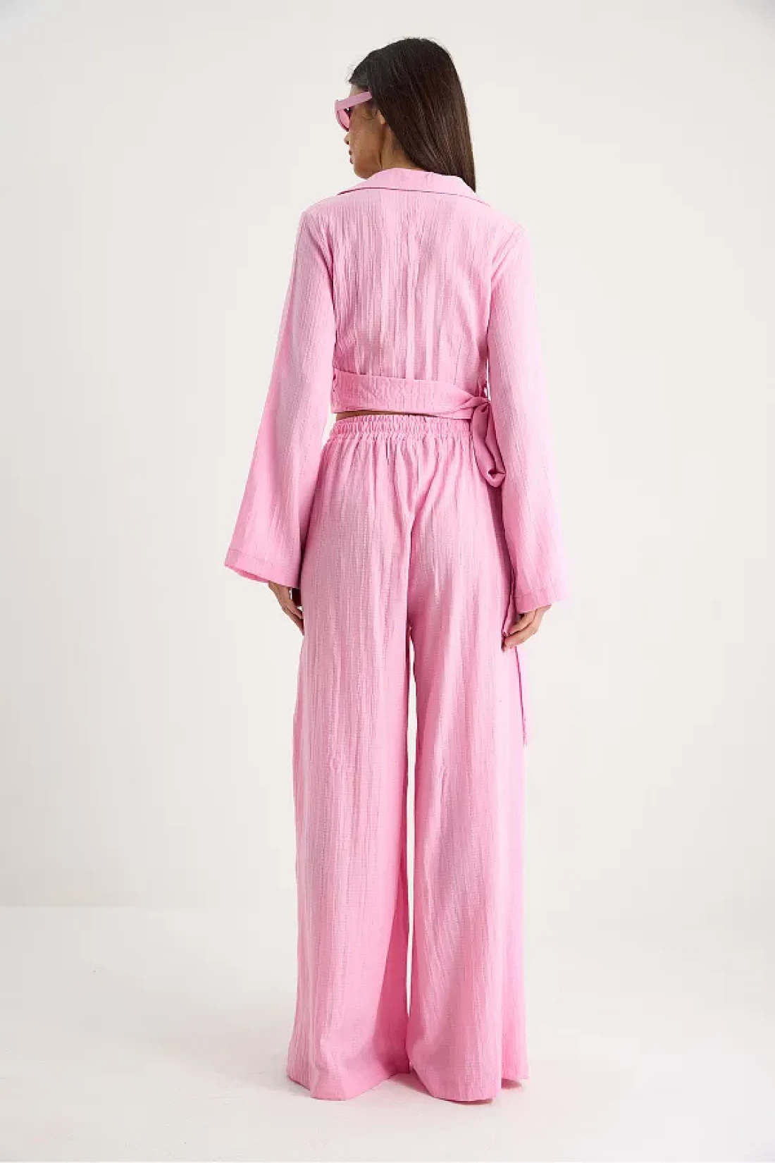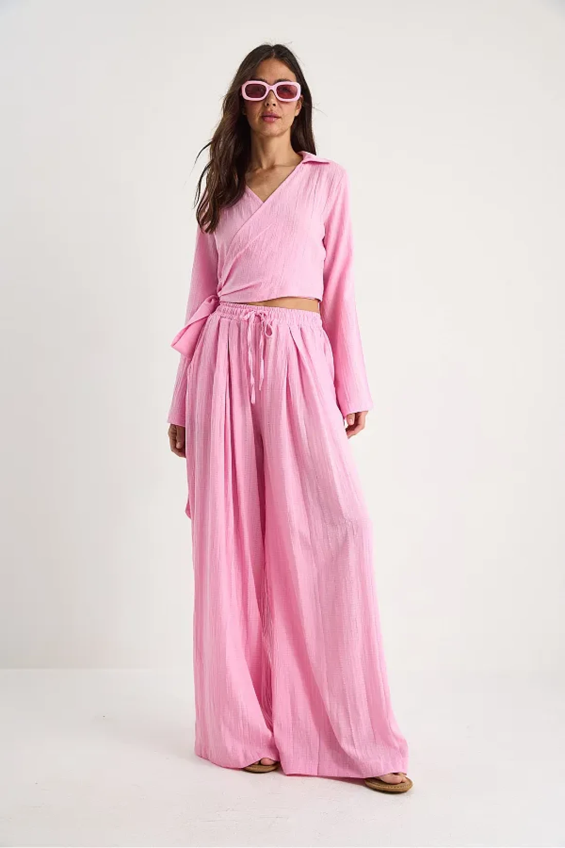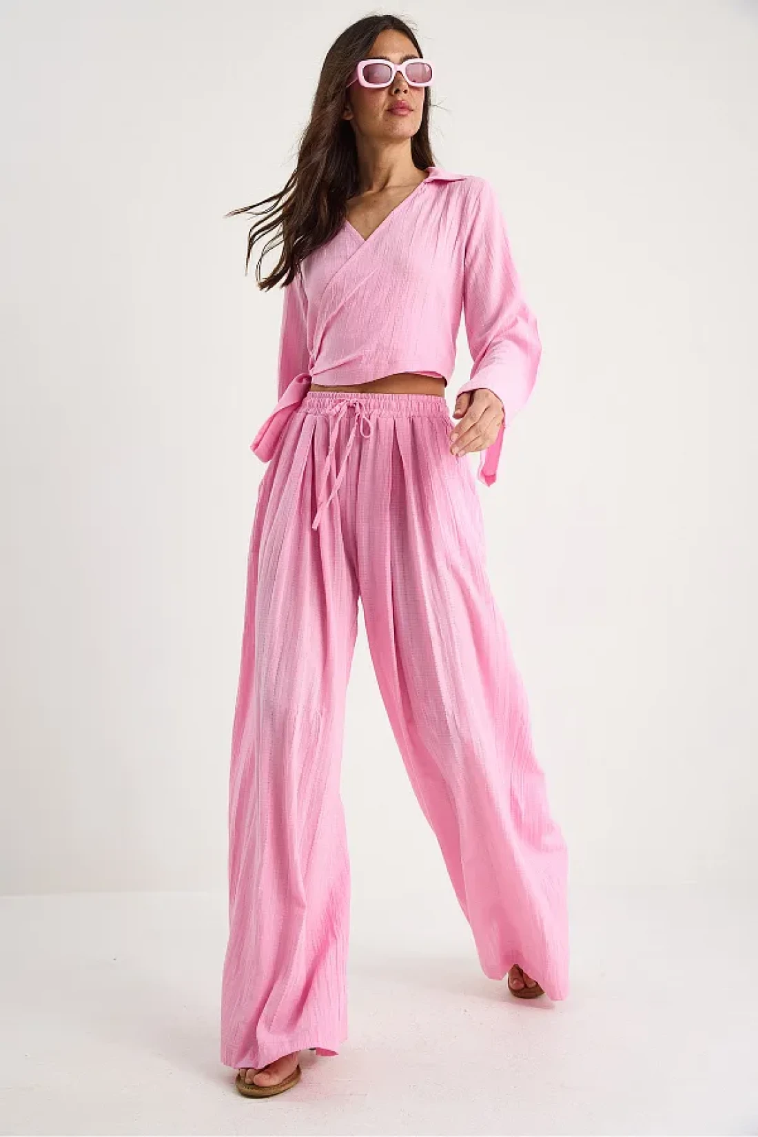 Bianco Lucci بلوزة نسائية برباط على شكل حرف V وجيب وخصر مطاطي وبنطلون فضفاض 60283324