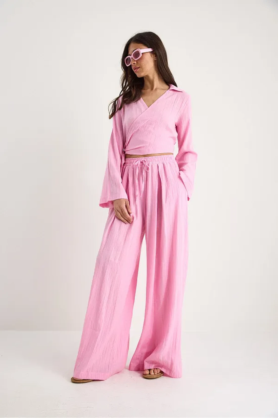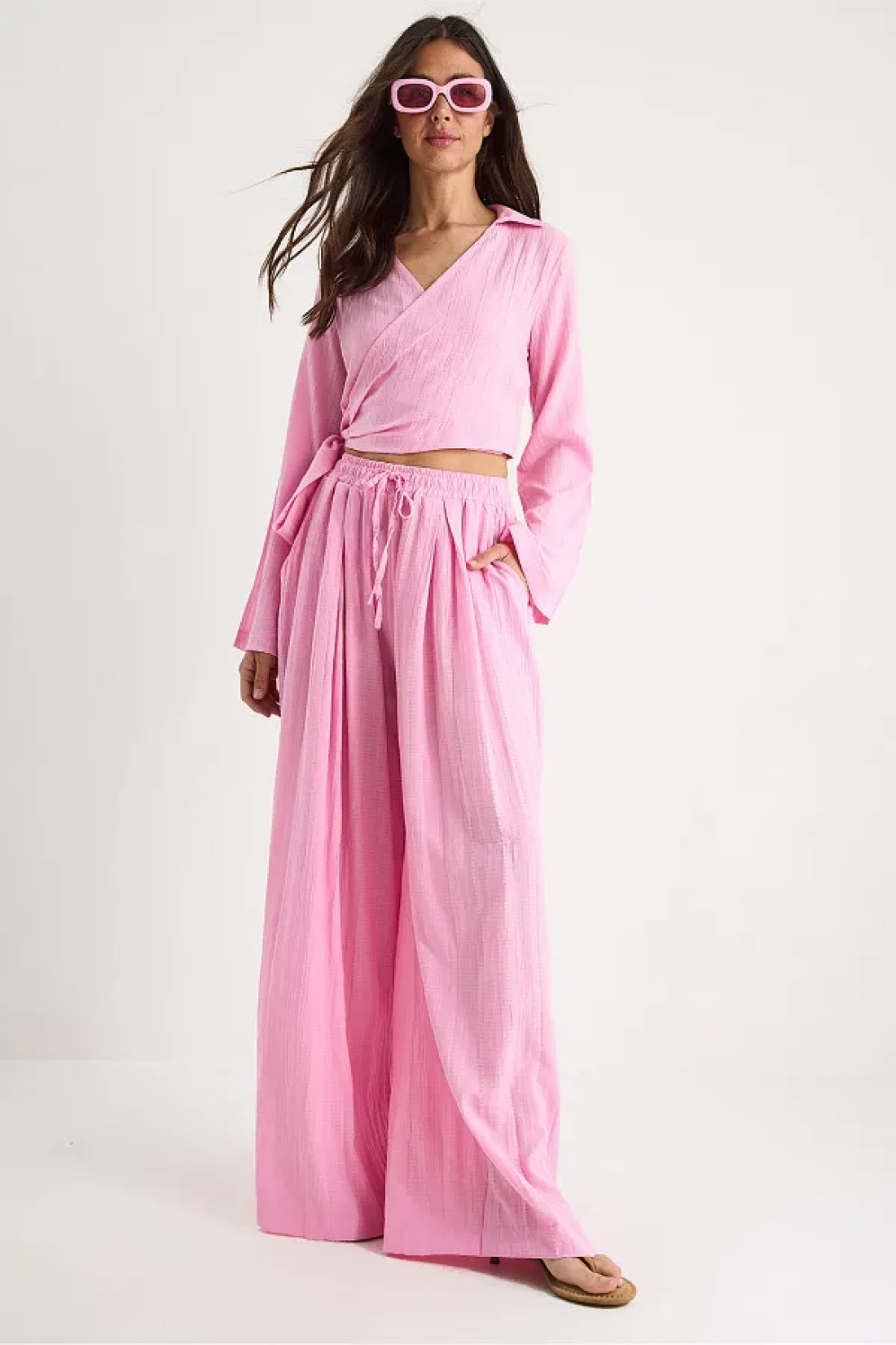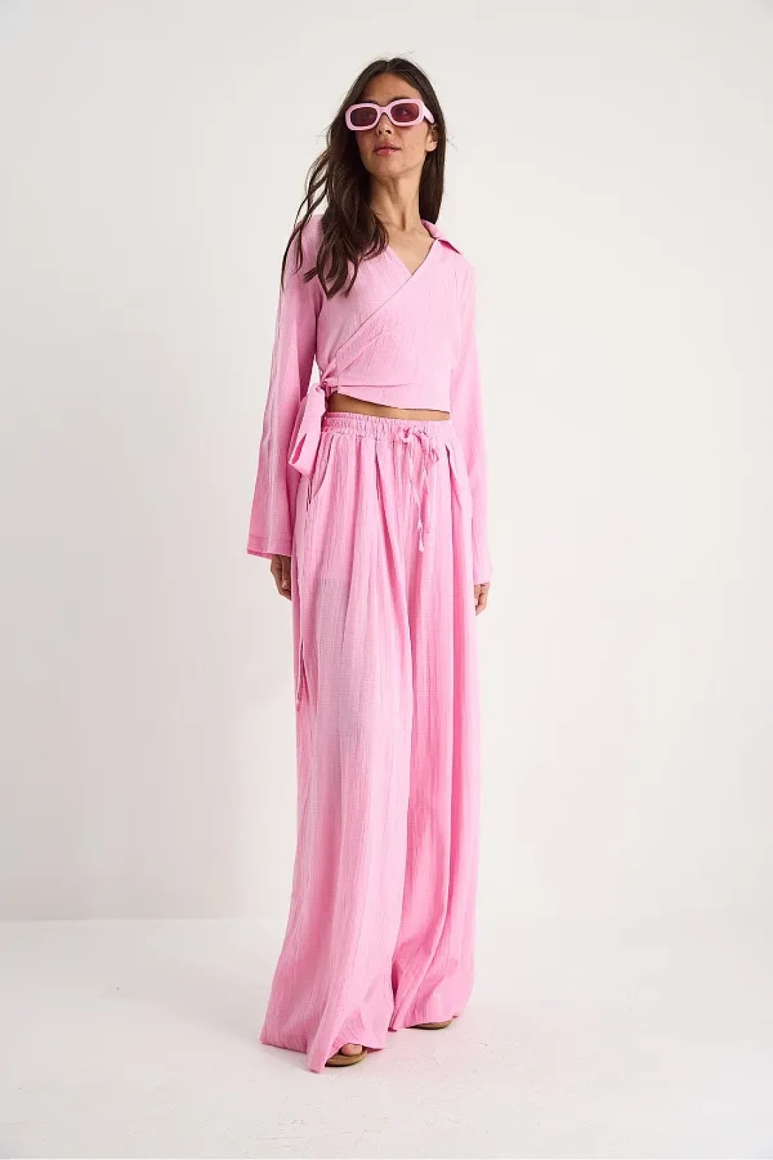 Bianco Lucci بلوزة نسائية برباط على شكل حرف V وجيب وخصر مطاطي وبنطلون فضفاض 60283324