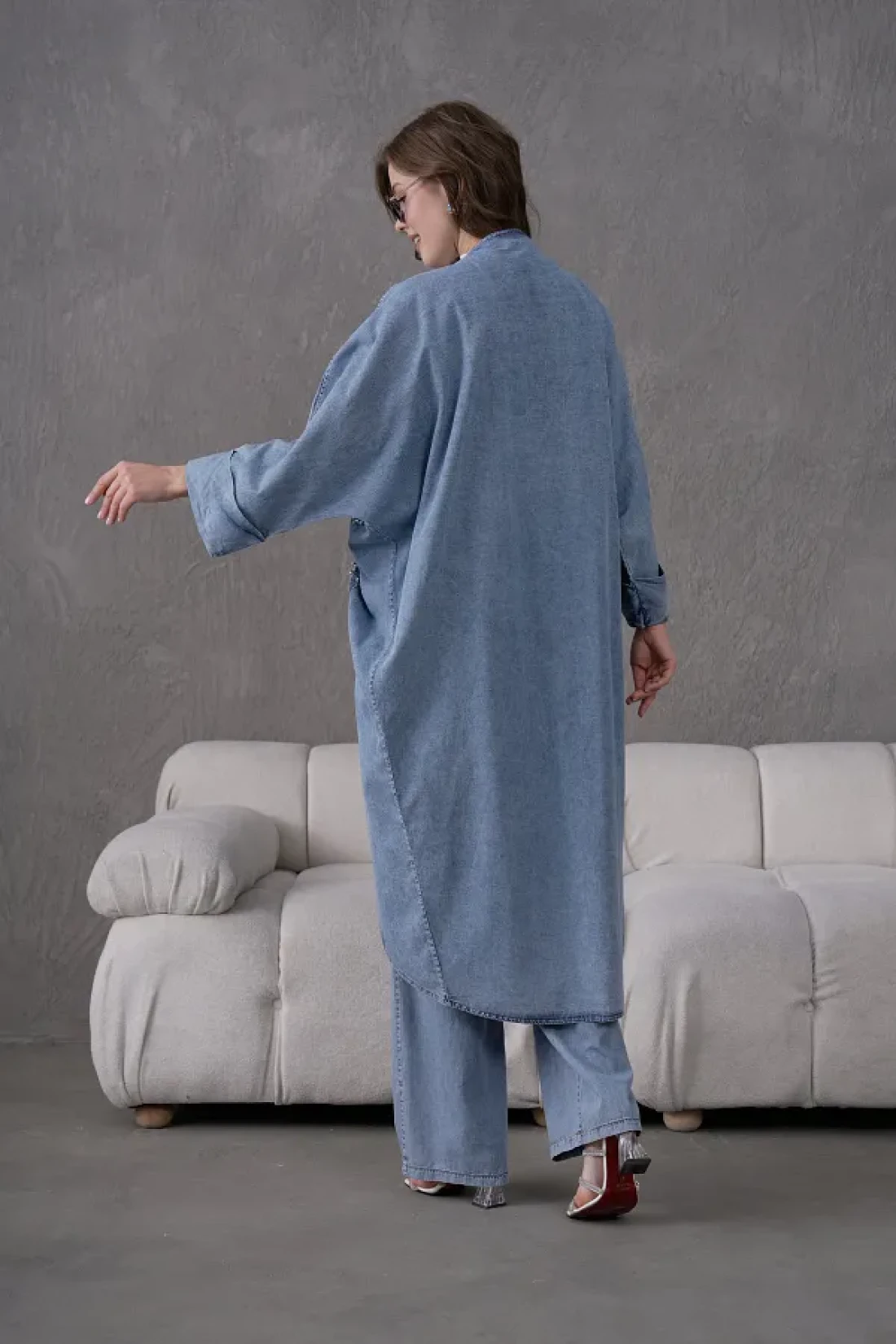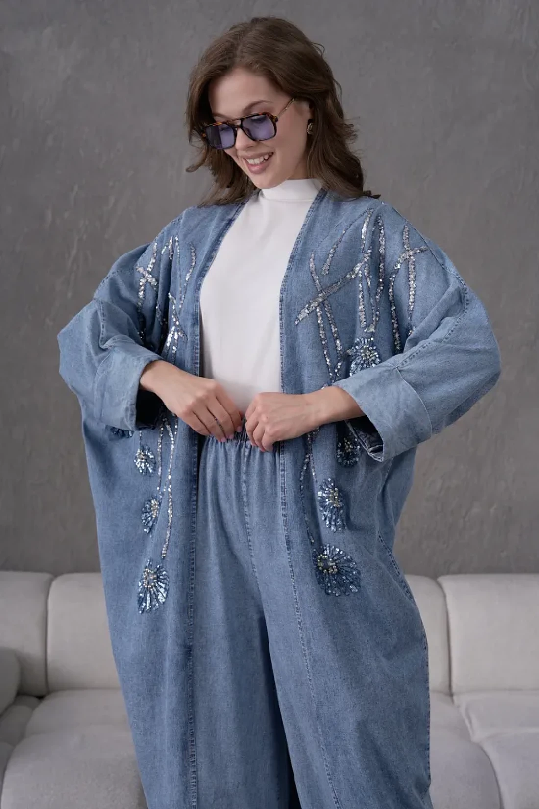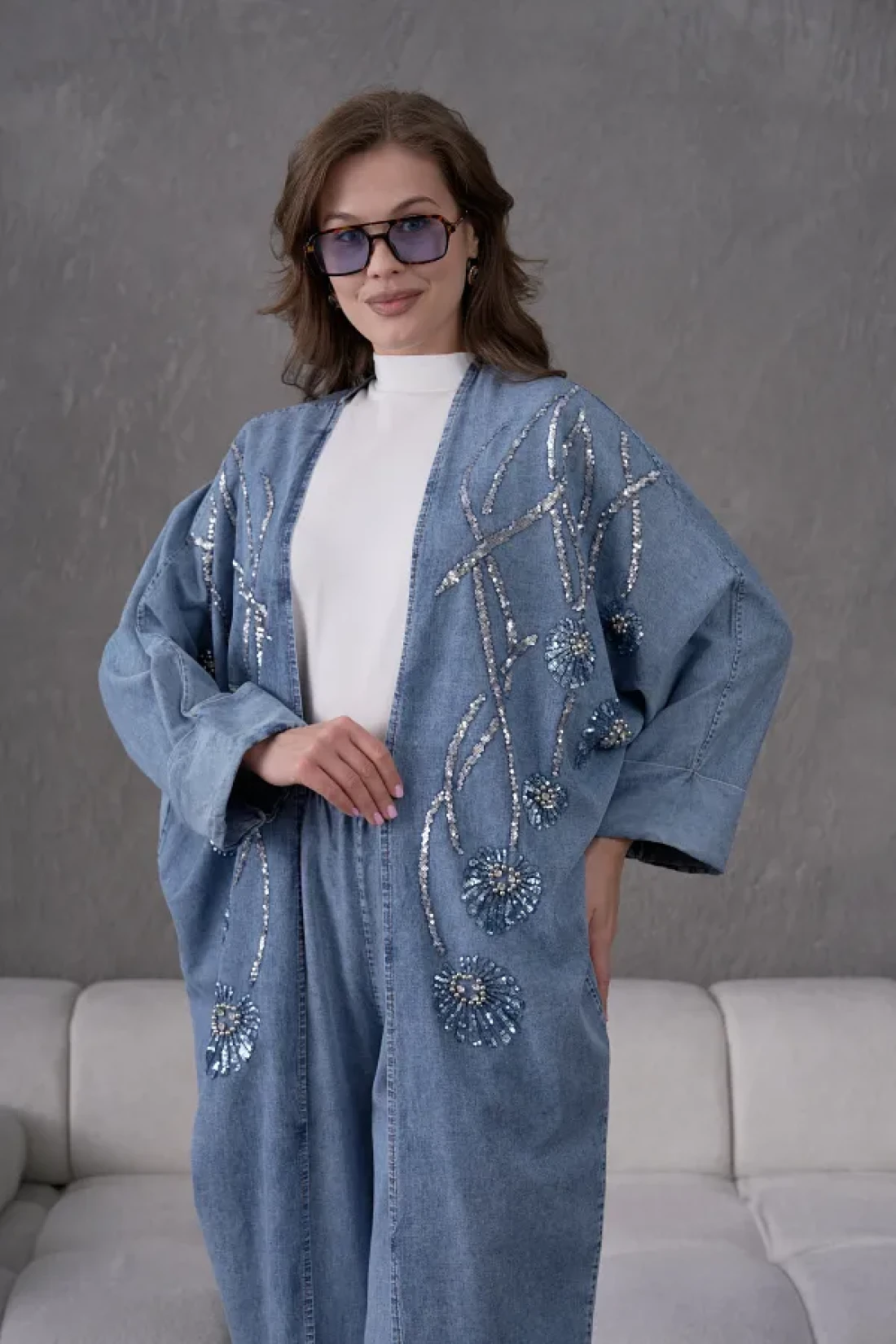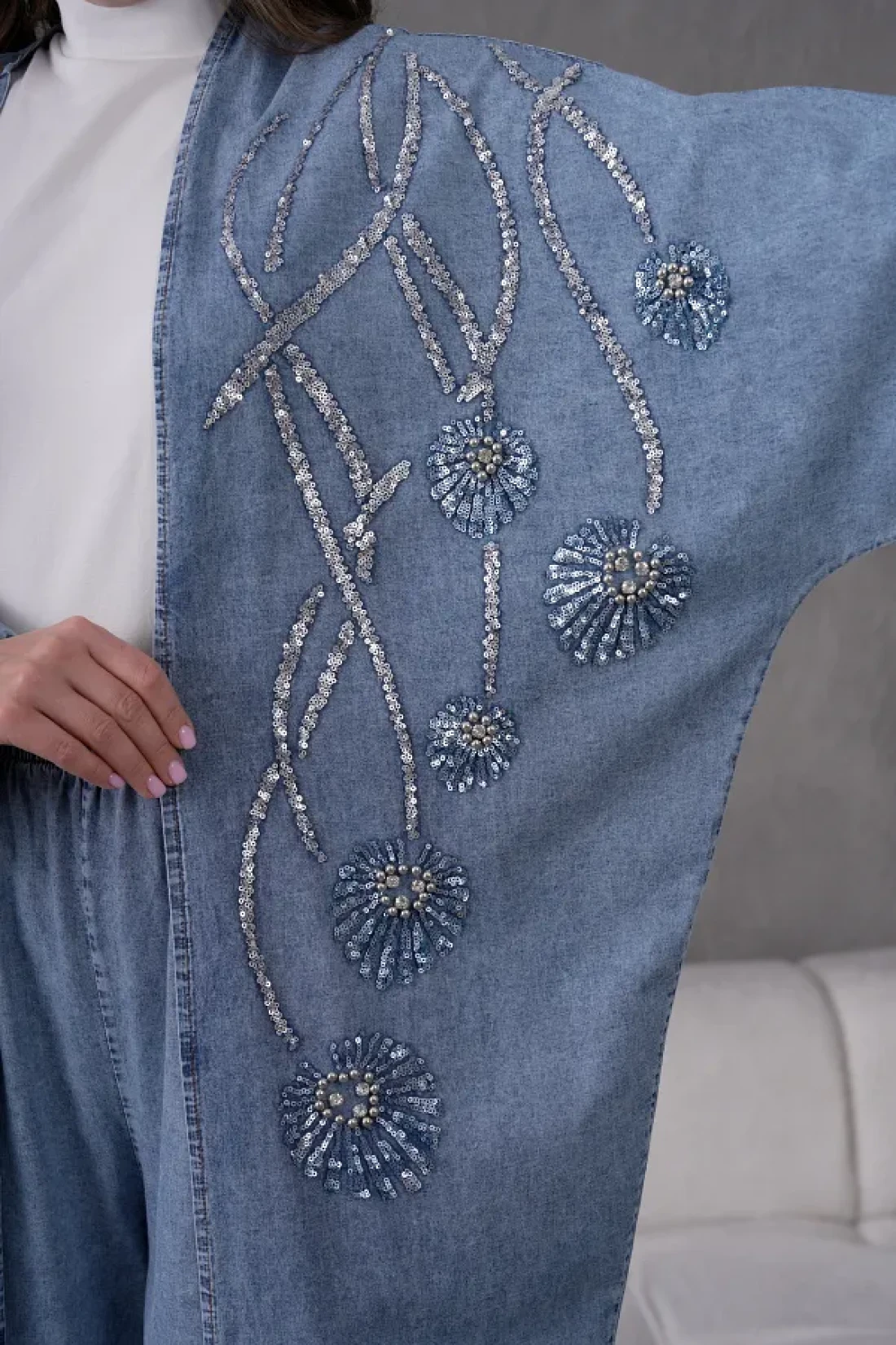 Miss Allos طقم كيمونو نسائي من قماش الدنيم المطرز بالترتر والترتر واللؤلؤ واللؤلؤ وسروال من قماش الدنيم