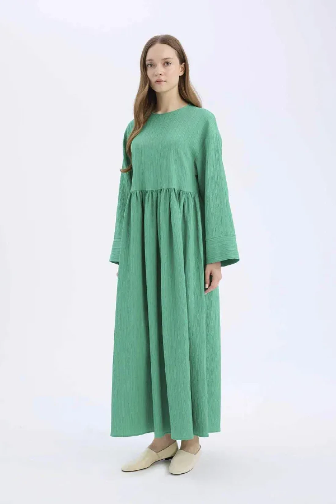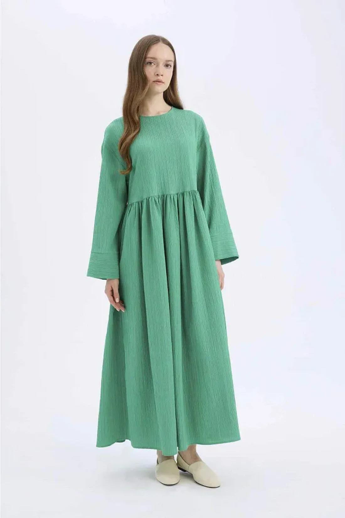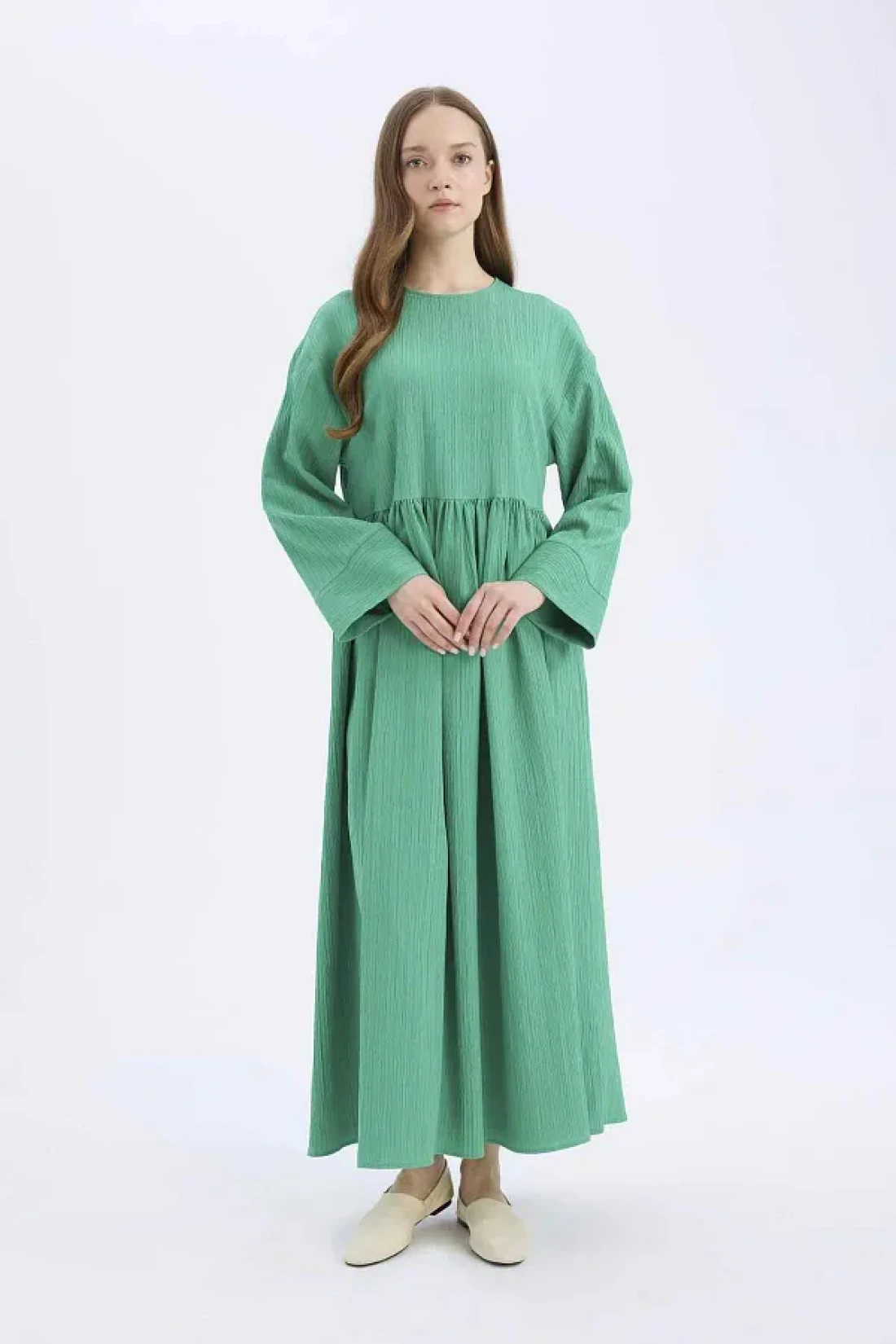 Defacto فستان طويل بأكمام طويلة ورقبة دائرية من القماش القطني - مقاس عادي E6597AX25SP