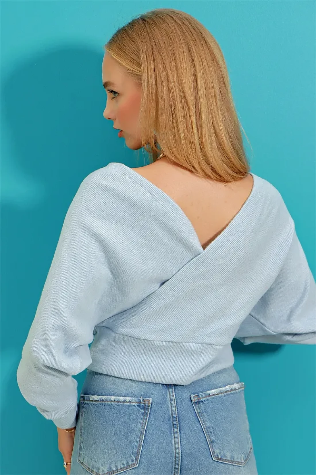 Trend Alaçatı Stili بلوزة نسائية زرقاء من الأمام ورقبة على شكل حرف V مزدوجة الصدر ALC-019-053-BLZ