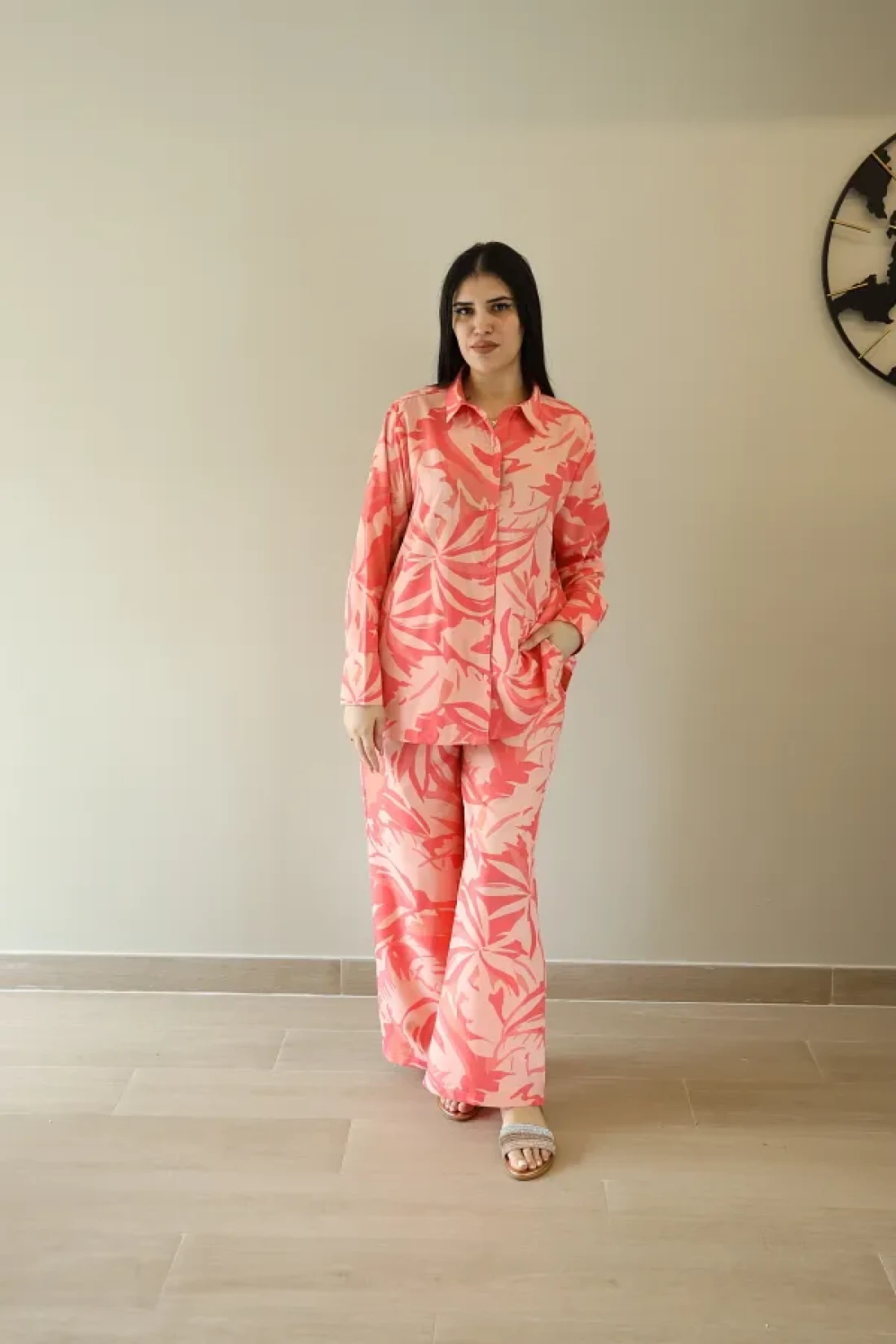 LINELLE طقم بنطلون نسائي منسق - بنطلون وقميص وردي مطبوع بأكمام طويلة