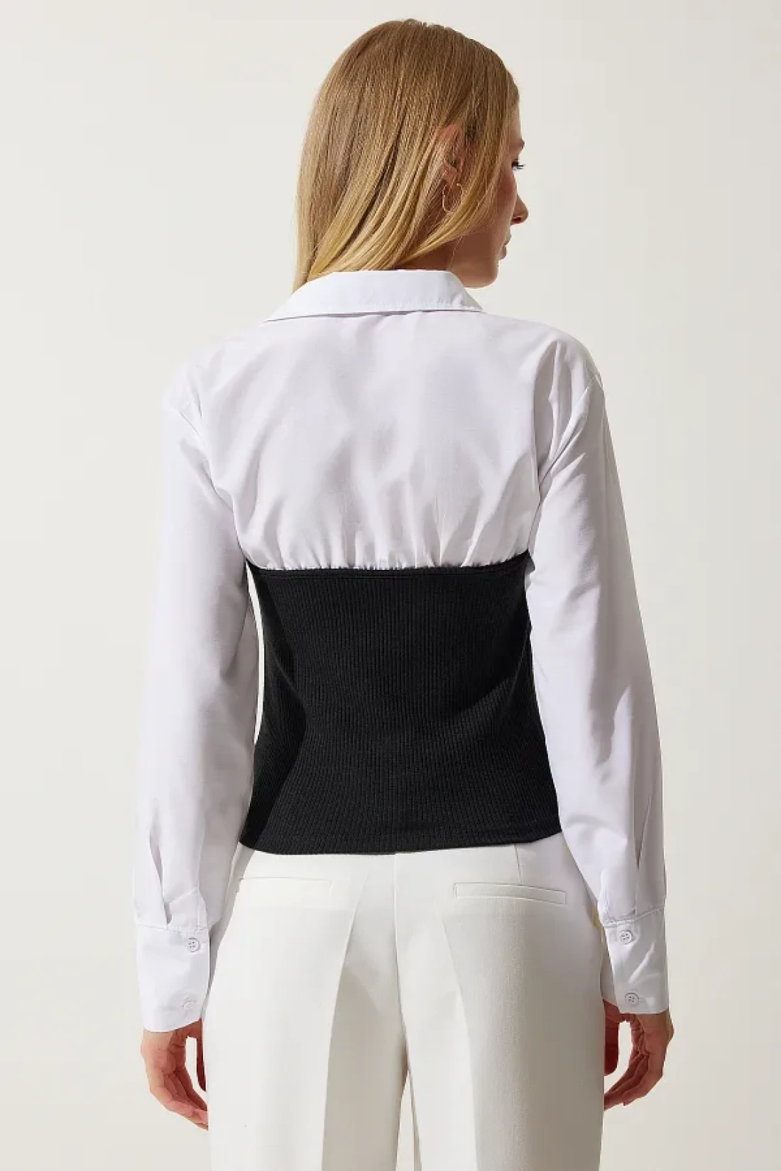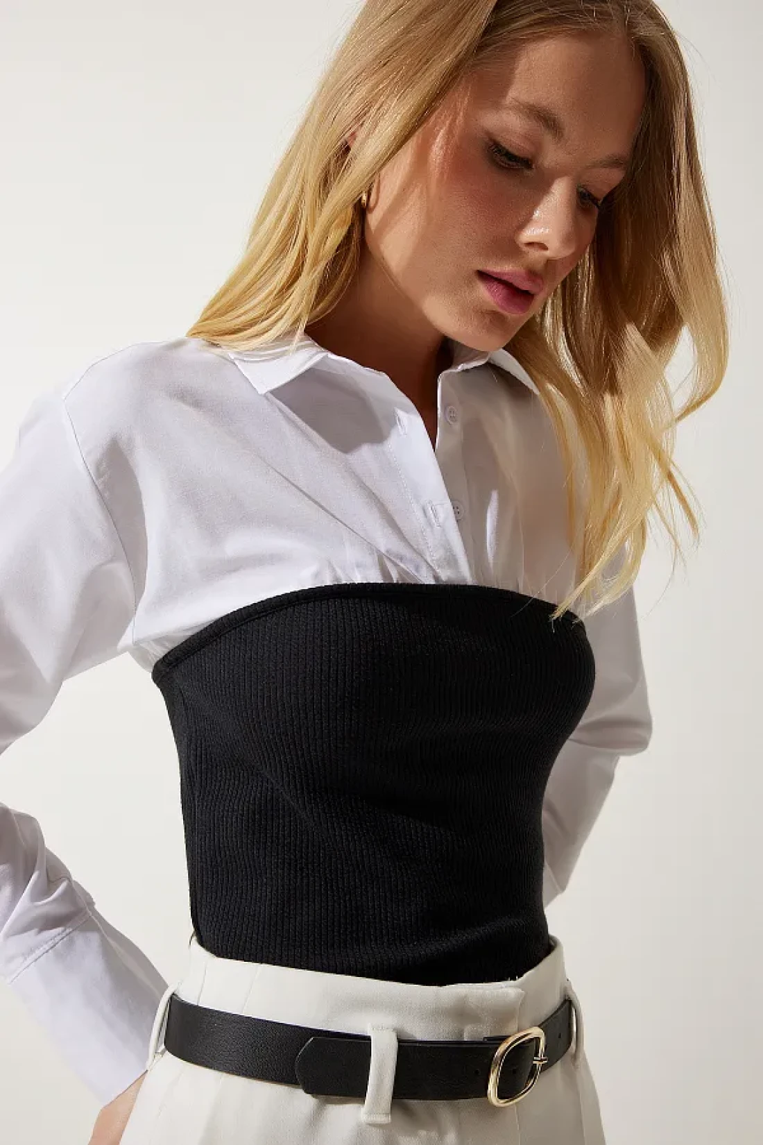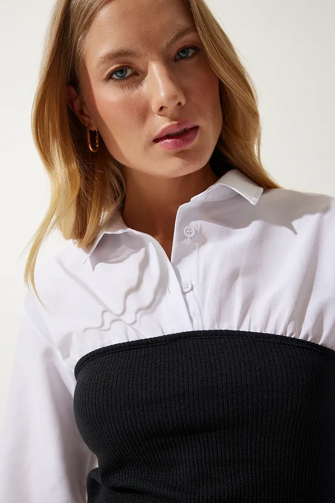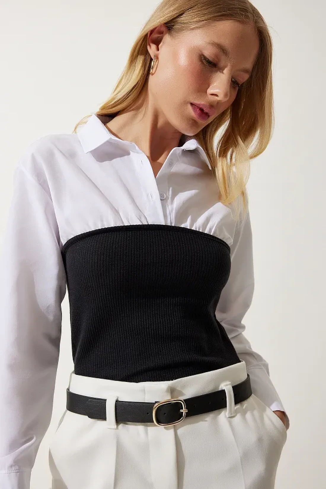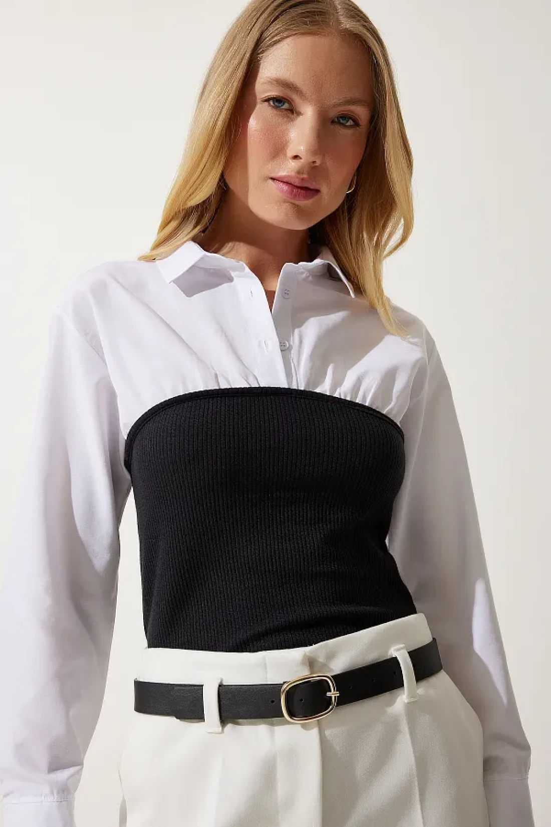 Happiness İstanbul بلوزة قميص بولو بياقة بولو بيضاء وسوداء للنساء AN00174