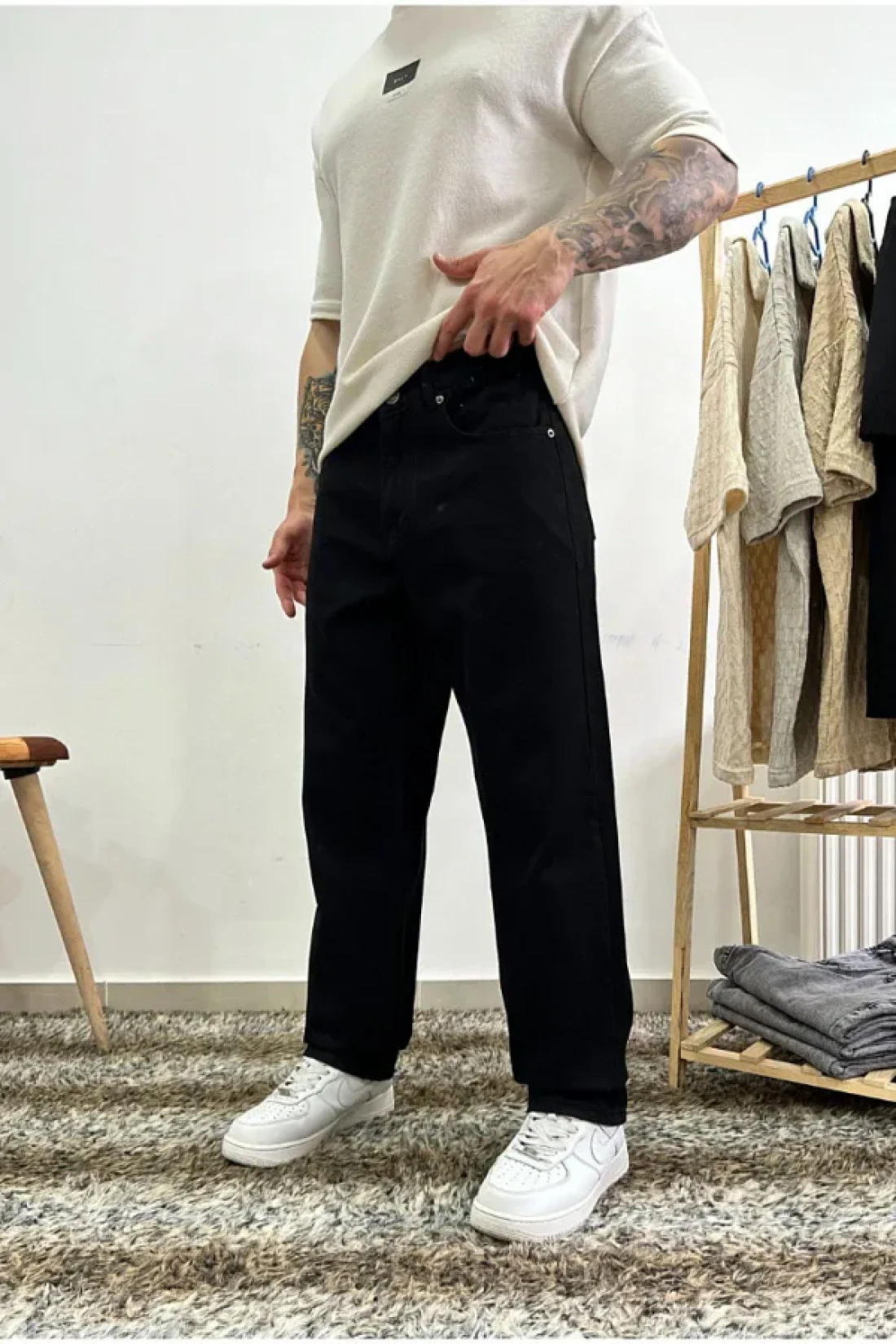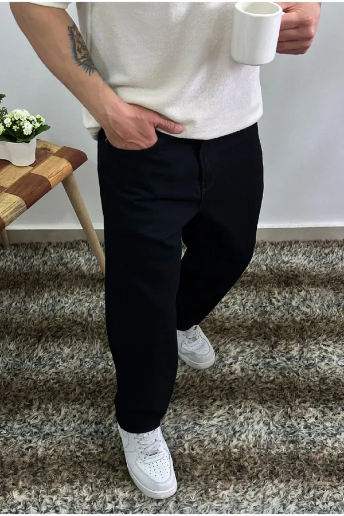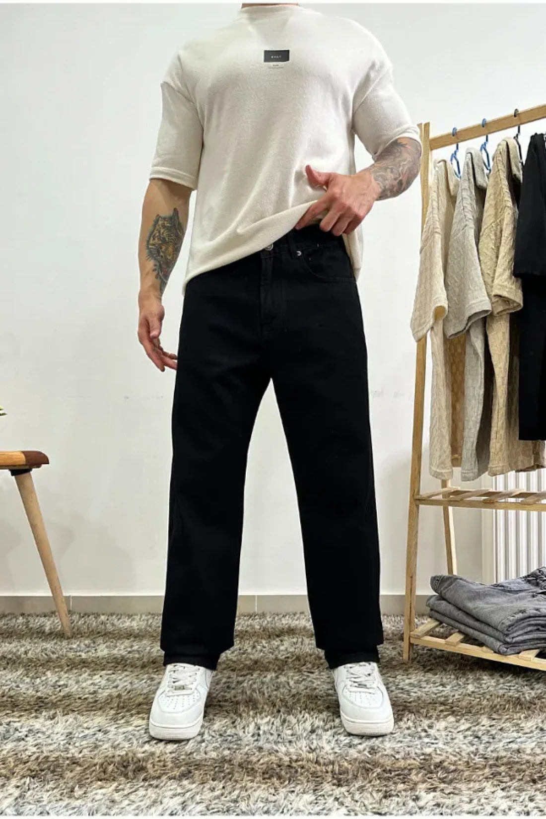 البنطلون الأسود، الذي يوفر الراحة والمظهر الأنيق مع نمطه الفضفاض، يتناسب مع جميع أنواع التركيبات.