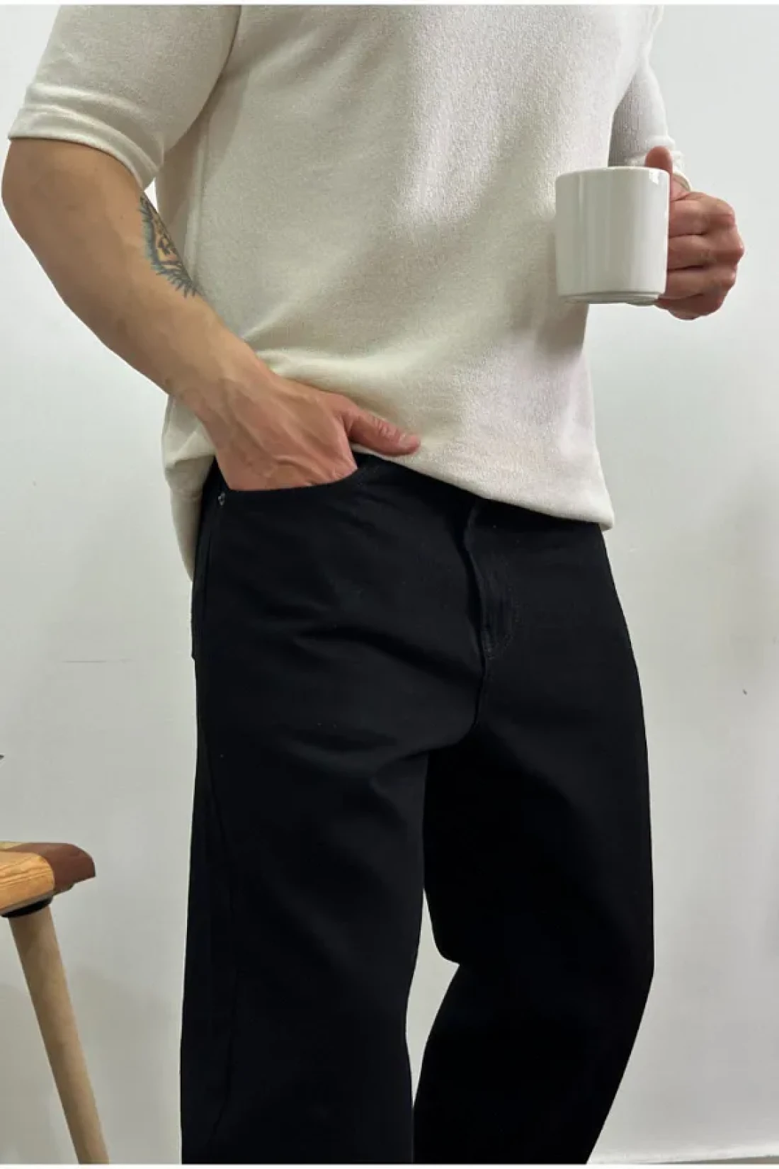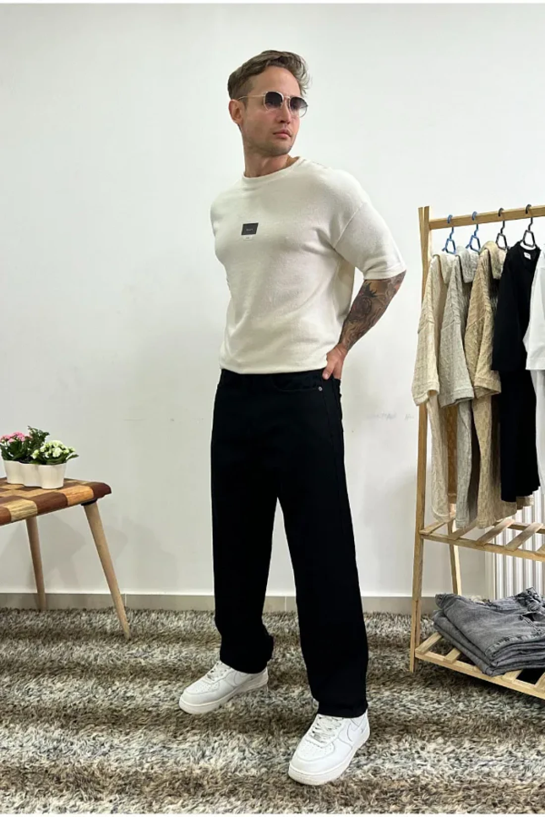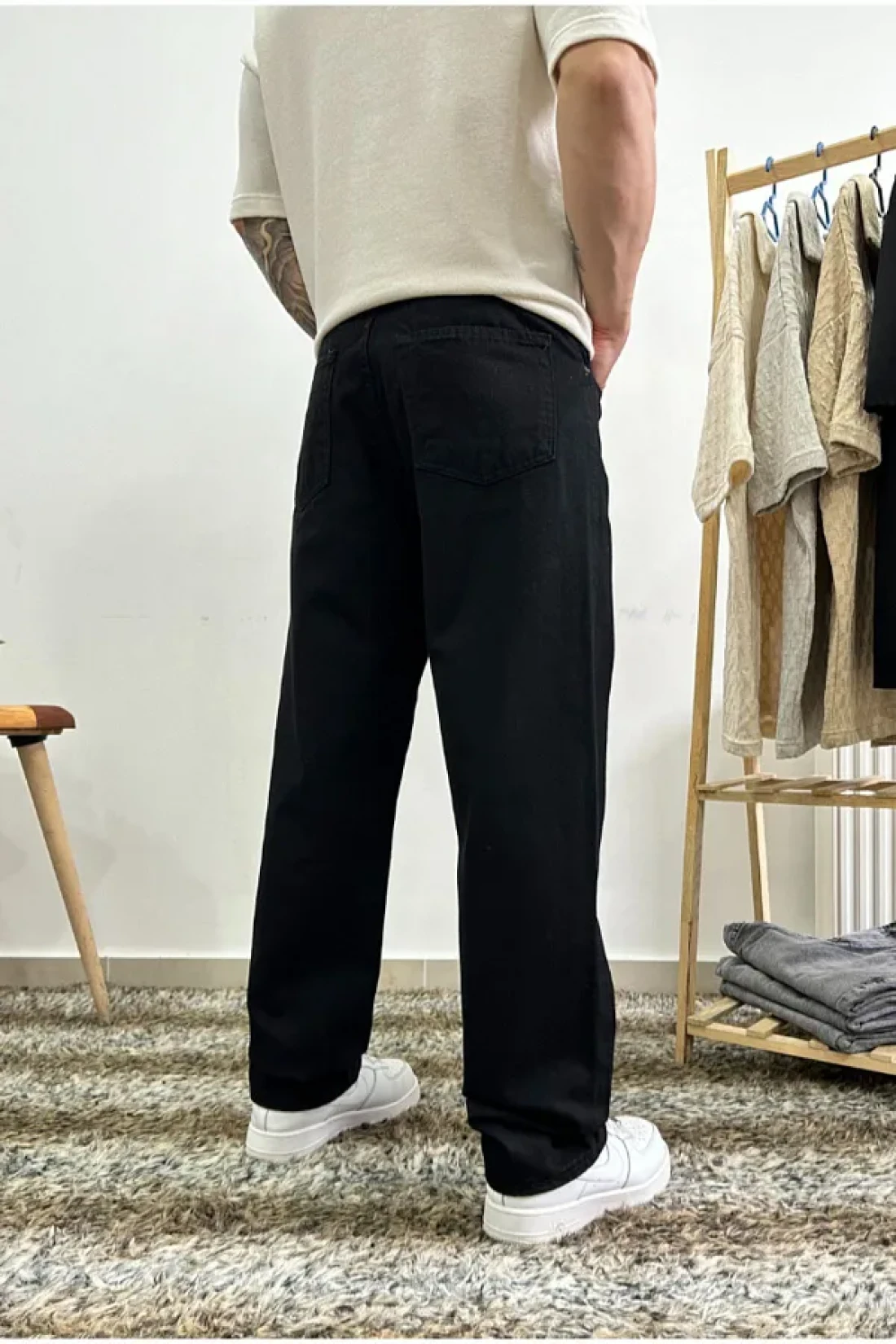 البنطلون الأسود، الذي يوفر الراحة والمظهر الأنيق مع نمطه الفضفاض، يتناسب مع جميع أنواع التركيبات.
