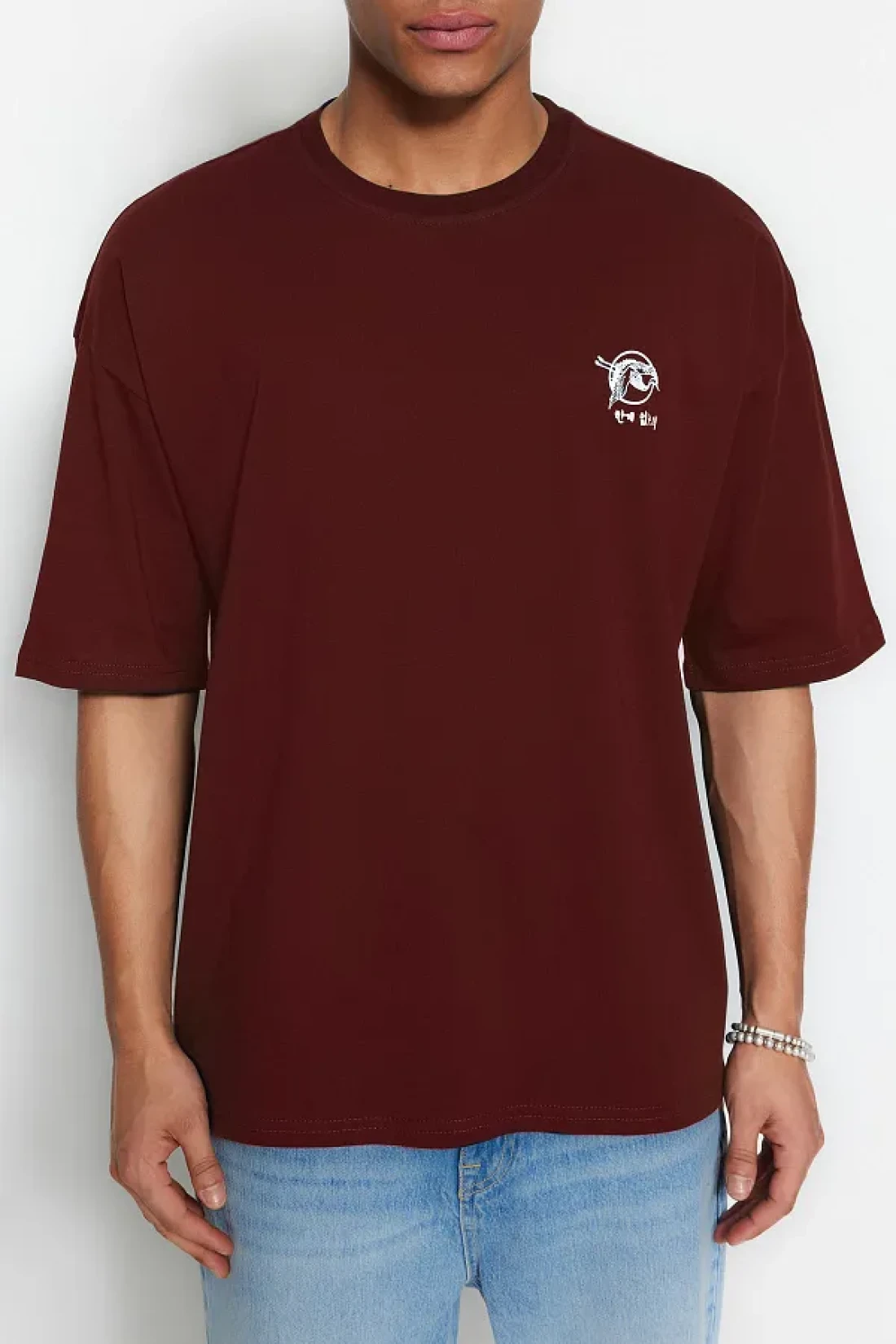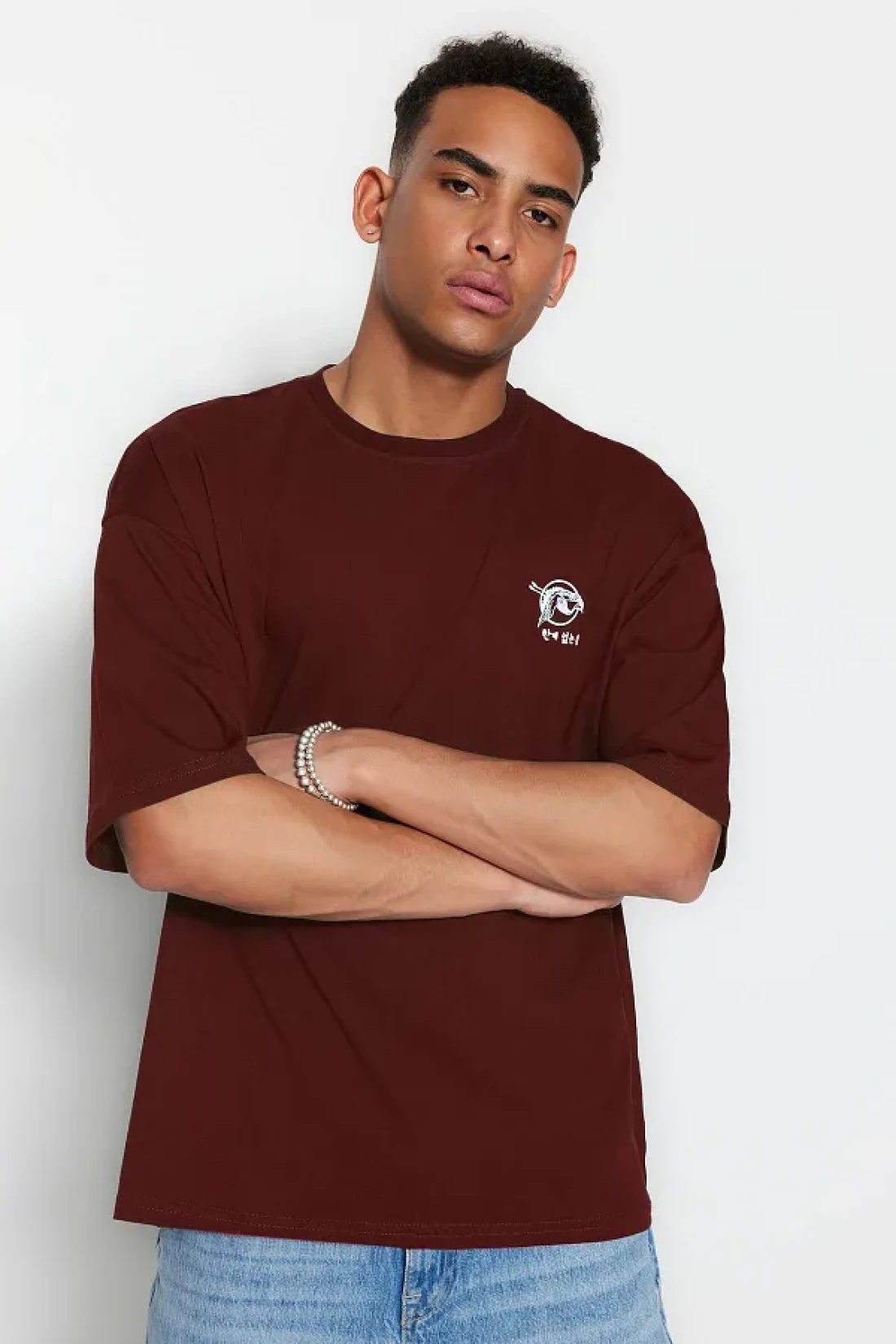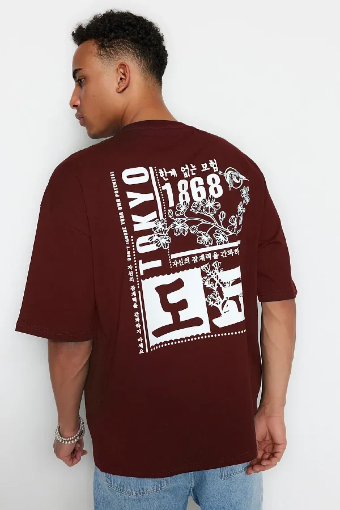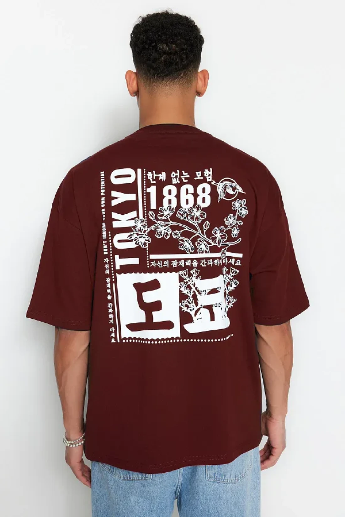 Collection تي شيرت قطني بني كبير الحجم بنمط الشرق الأقصى - TMNSS23TS00170