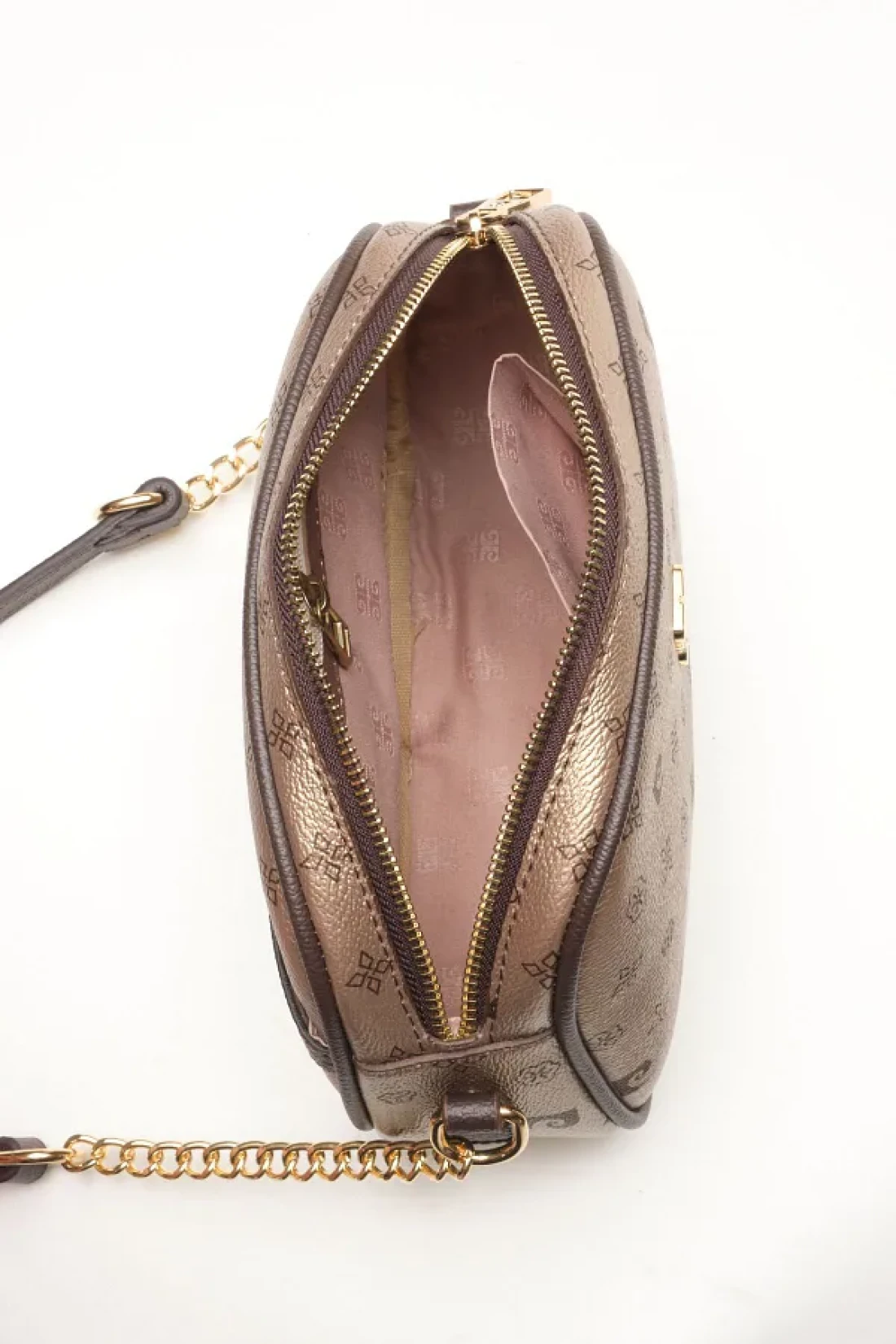 هناك حزام طويل مع تفاصيل سلسلة قابلة للتعديل متوفرة. العرض × الارتفاع × العمق: 23x17x9 سم. لديه ميزة الإغلاق بواسطة السحاب. لديه جيب داخلي مزود بسحاب. هناك جيب بدون سحاب في الخلف.
