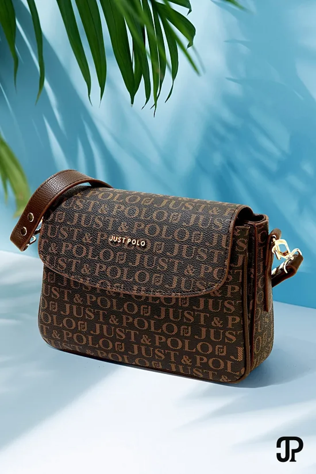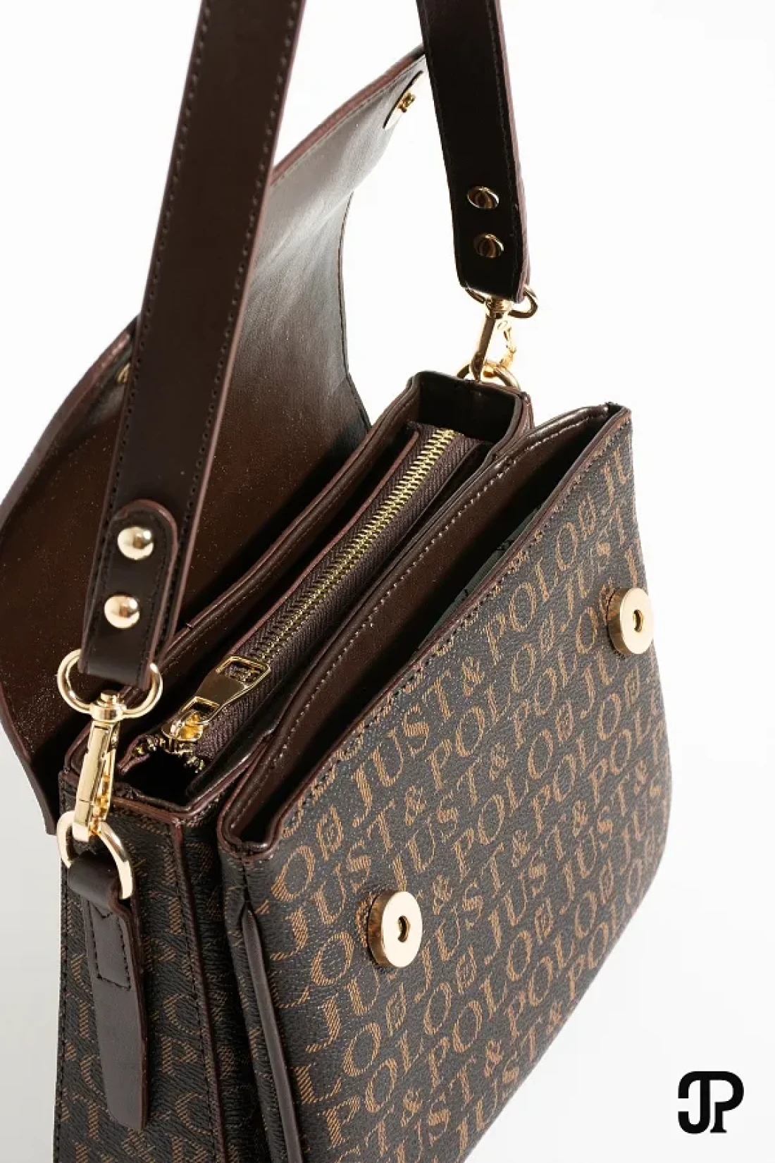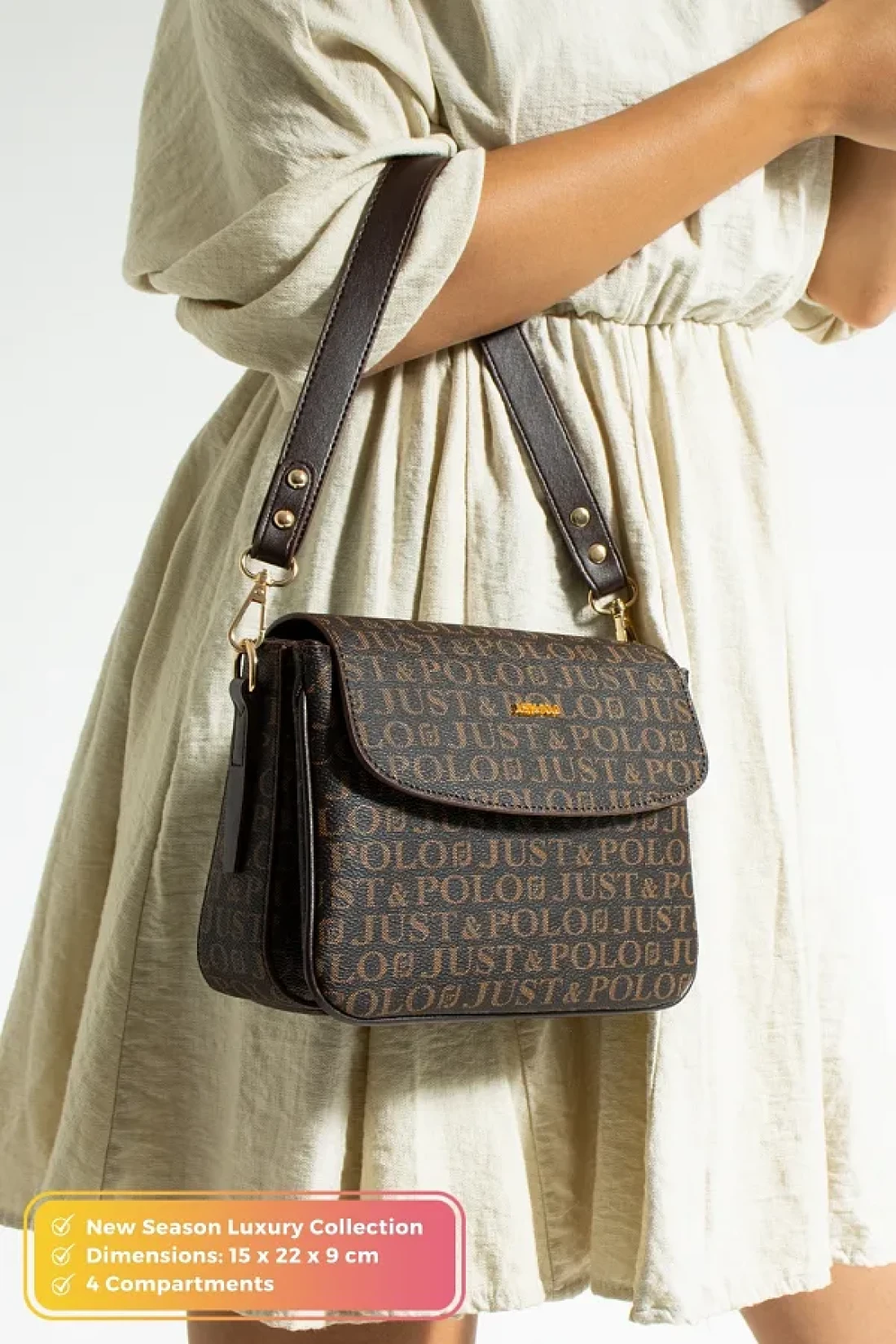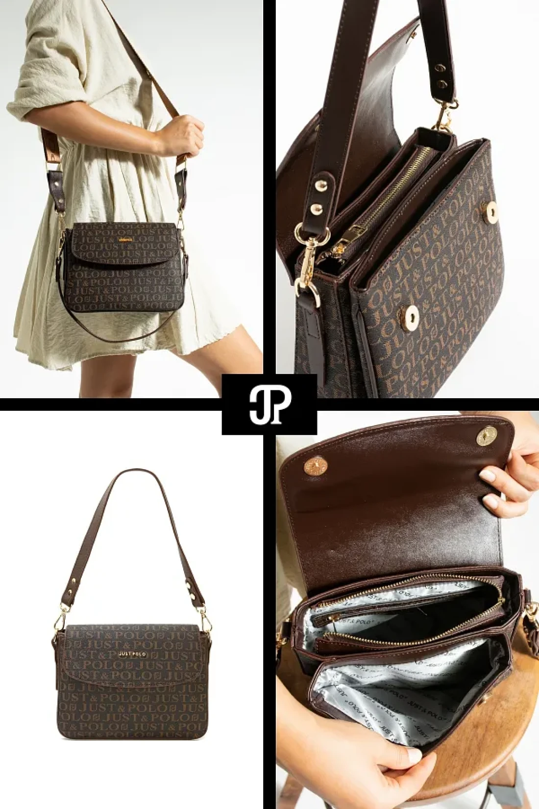 Just Polo حقيبة كتف نسائية أصلية فاخرة من الجلد الناعم مكونة من 4 أقسام وحزام عمودي متقاطع قابل للتعديل