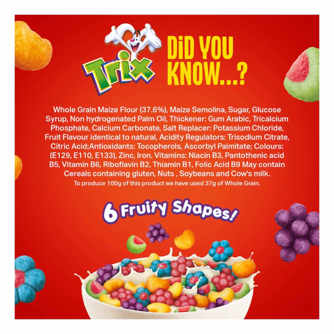 - حبوب إفطار لذيذة بنكهة الفواكه تتميز بأشكال نابضة بالحياة وملونة تجعل وجبة الإفطار ممتعة للأطفال والكبار على حد سواء