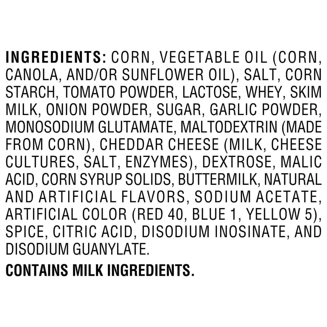 ingredients : ذرة، زيت نباتي (ذرة، كانولا، و/أو زيت دوار الشمس)، ملح، نشا ذرة، مسحوق طماطم، لاكتوز، مصل اللبن، حليب خالي الدسم، مسحوق بصل، سكر، مسحوق ثوم، غلوتامات أحادية الصوديوم، مالتوديكسترين (مصنوع من الذرة)، جبن شيدر (حليب، مزارع جبن، ملح، إنزيمات)، دكستروز، حمض الماليك، مواد صلبة من شراب الذرة، لبن رائب، نكهات طبيعية وصناعية، أسيتات الصوديوم، لون صناعي (أحمر 40، أزرق 1، أصفر 5)، توابل، حمض الستريك، إينوزينات ثنائي الصوديوم، وغوانيلات ثنائي الصوديوم.