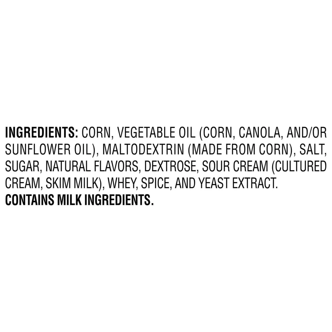 ingredients : الذرة، زيت نباتي (الذرة، الكانولا، و/أو زيت دوار الشمس)، مالتوديكسترين (مصنوع من الذرة)، ملح، سكر، نكهات طبيعية، دكستروز، كريمة حامضة (كريمة مخمرة، حليب خالي الدسم)، مصل اللبن، التوابل، ومستخلص الخميرة