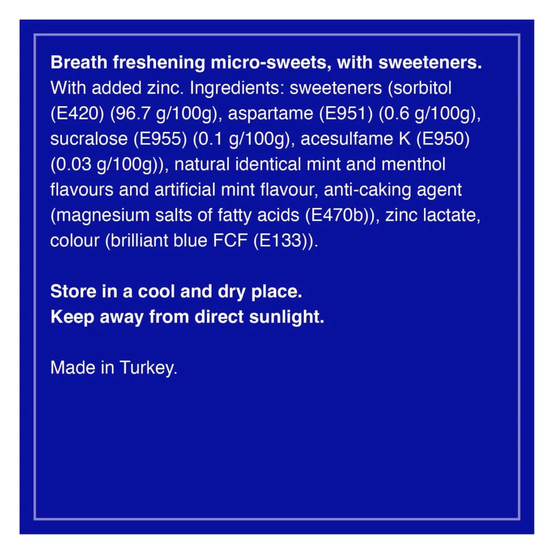 ingredients : مُحليات (سوربيتول (E420) (96.7 غرام/100 غرام)، أسبارتام (E951) (0.6 غرام/100 غرام)، سكرالوز (E955) (0.1 غرام/100 غرام)، أسيسولفام ك (E950) (0.03 غرام/100 غرام))، نكهات النعناع والمنثول الطبيعية المتطابقة ونكهة النعناع الاصطناعية، عامل مضاد للتكتل (أملاح المغنيسيوم للأحماض الدهنية (E470b))، لاكتات الزنك، لون (أزرق لامع Fcf (E133))