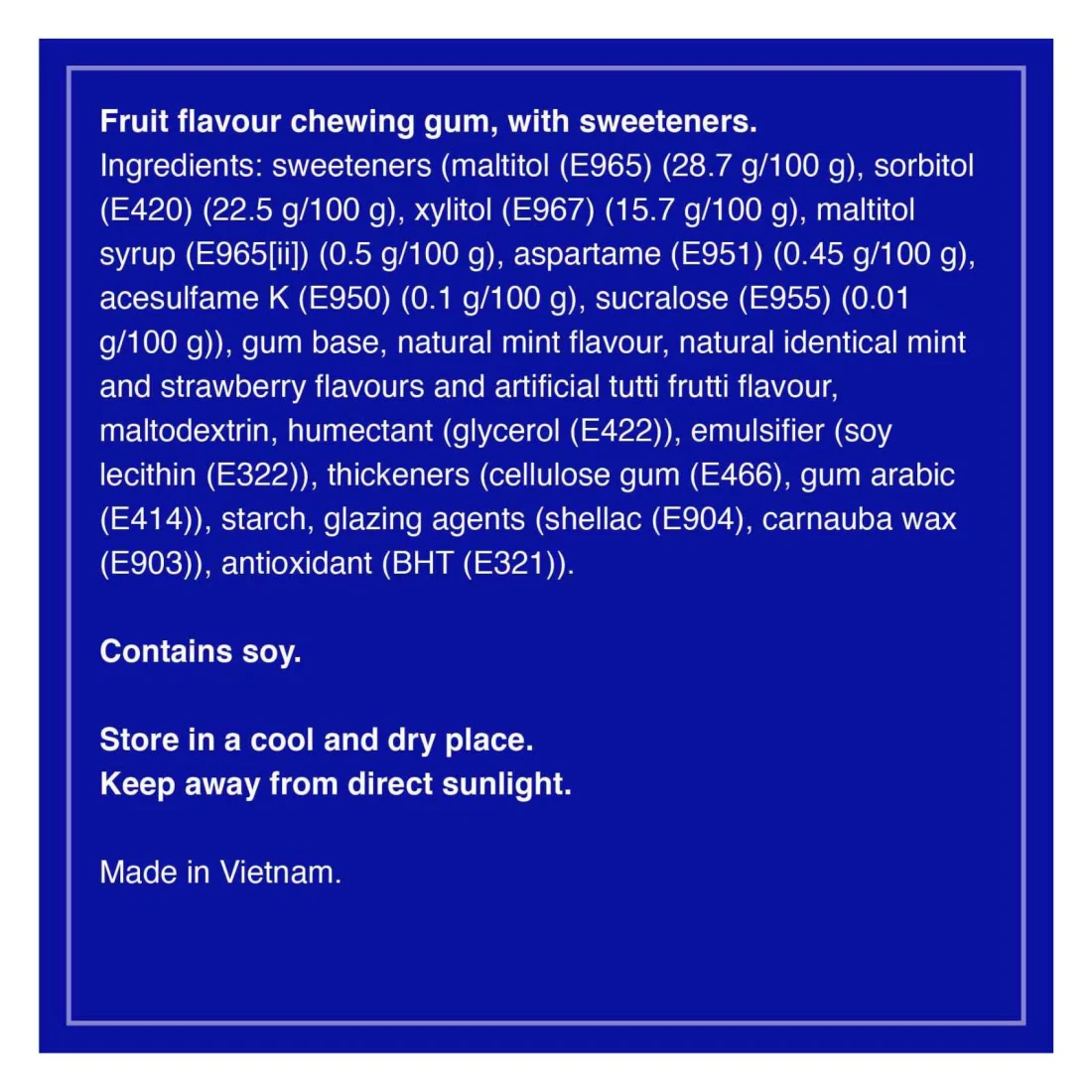 ingredients : محليات (مالتيتول (E965) (28.7 غ/100 غ)، سوربيتول (E420) (22.5 غ/100 غ)، زيليتول (E967) (15.7 غ/100 غ)، شراب المالتيتول (E965[ii]) (0.5 غ/100 غ)، أسبارتام (E951) (0.45 غ/100 غ)، أسيسلفام ك (E950) (0.1 غ/100 غ)، سوكرالوز (E955) (0.01 غ/100 غ))، قاعدة العلكة، نكهة النعناع الطبيعية، نكهات النعناع والفراولة المطابقة للطبيعة والنكهة الصناعية توتي فروتي، مالتوديكسترين، مرطّب (غليسرول (E422))، مستحلب (ليسيثين الصويا (E322))، مثخنات (صمغ السليلوز (E466)، صمغ الأكاسيا (E414))، نشا، مواد تلميع (شيلاك (E904)، شمع الكارنوبا (E903))، مضاد أكسدة (بي إتش تي (E321))