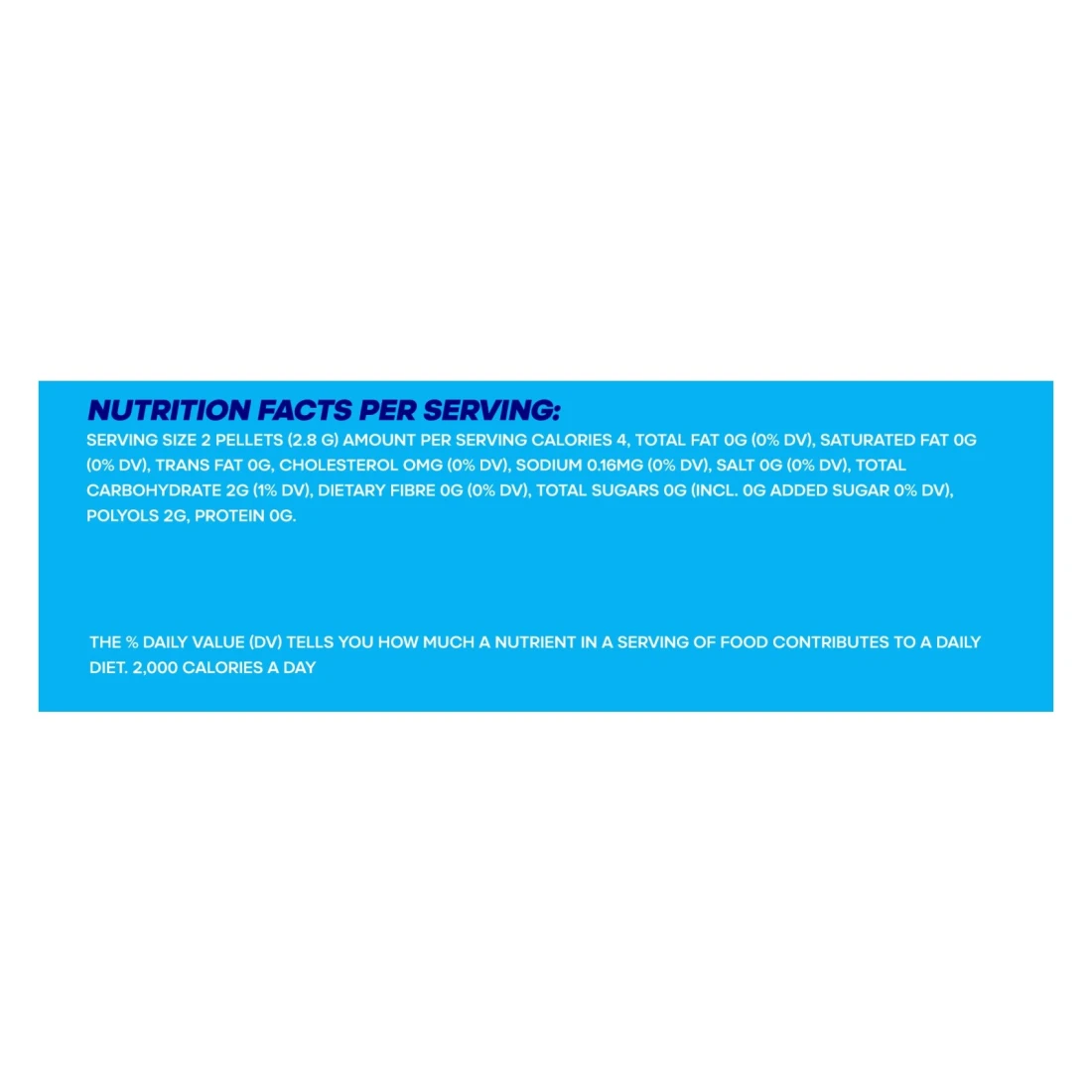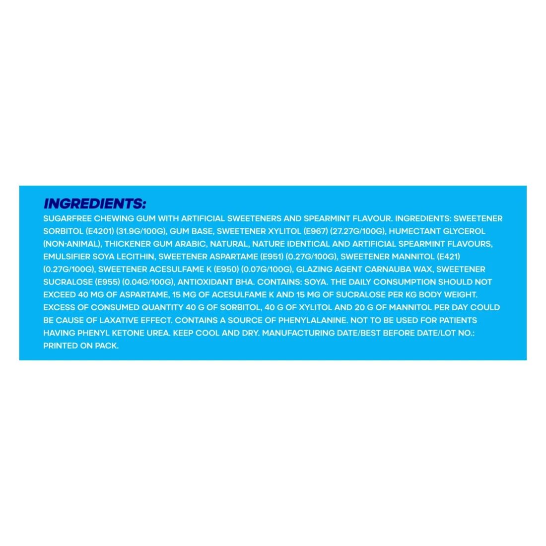ingredients : مُحلي سوربيتول (E4201) (31.9 غرام/100 غرام)، قاعدة صمغية، مُحلي إكسيليتول (E967) (27.27 غرام/100 غرام)، مُرطب غلسرين (غير حيواني)، مُكثف صمغ عربي، نكهات طبيعية، مُطابقة للطبيعة ونكهات اصطناعية من النعناع، مُستحلب ليسيثين الصويا، مُحلي أسبارتام (E951) (0.27 غرام/100 غرام)، مُحلي مانيتول (E421) (0.27 غرام/100 غرام)، مُحلي أسيسولفام ك (E950) (0.07 غرام/100 غرام)، عامل التزجيج شمع كارنوبا، مُحلي سكرالوز (E955) (0.04 غرام/100 غرام)، مُضاد الأكسدة بيتا هيدروكسي الأسيتون