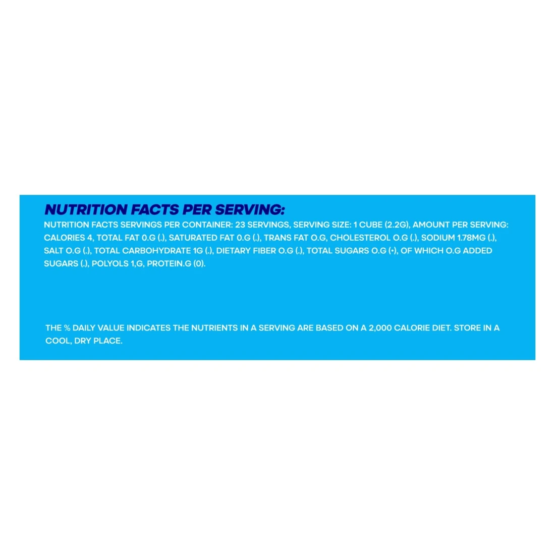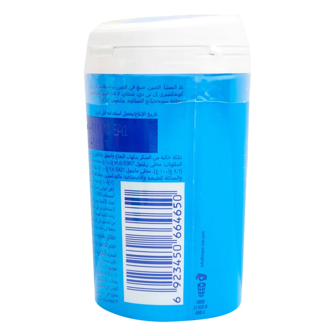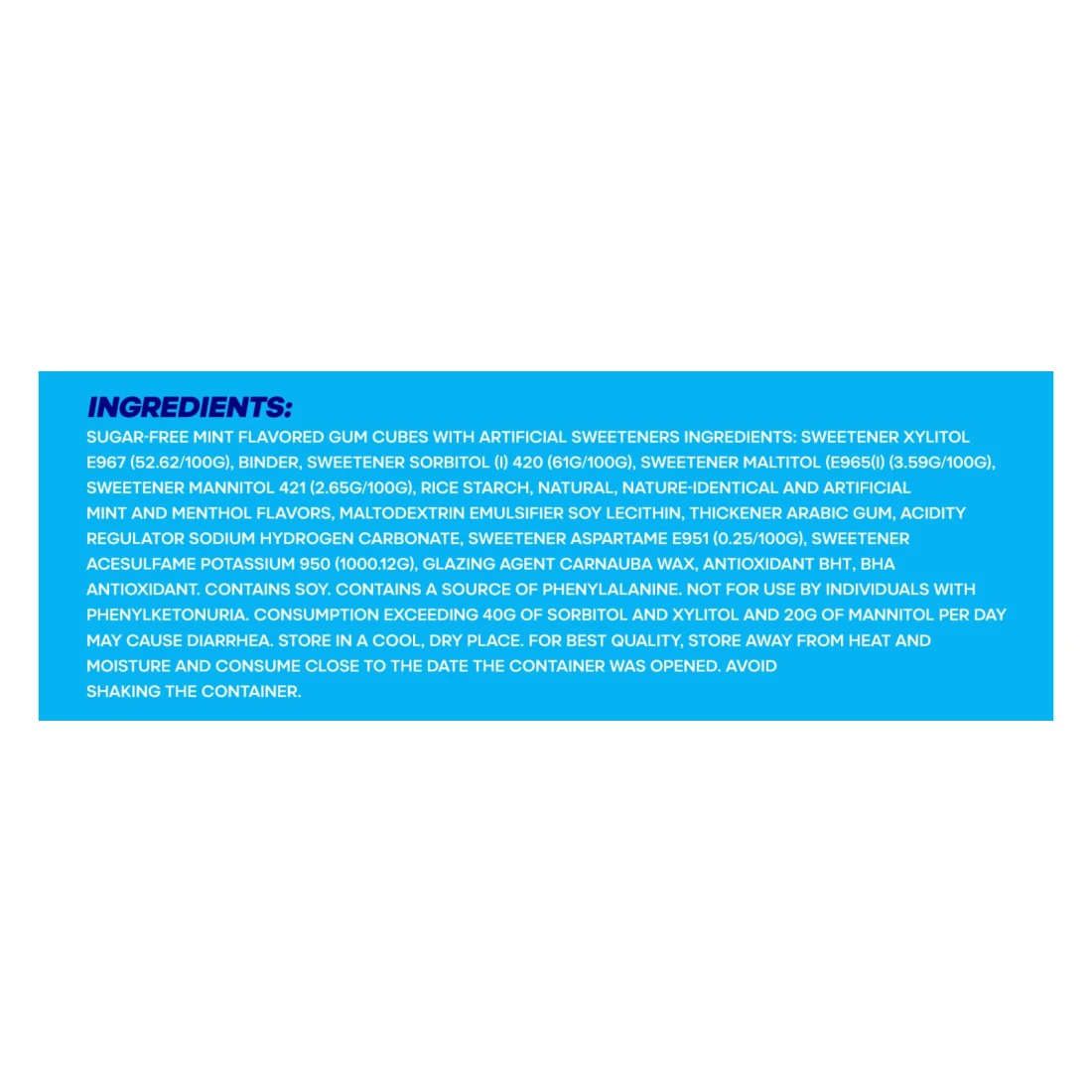 ingredients : مكعبات علكة بنكهة النعناع خالية من السكر مع محليات صناعية المكونات: مُحلي إكسيليتول E967 (52.62/100 غرام)، مادة رابطة، مُحلي سوربيتول (1) 420 (61 غرام/100 غرام)، مُحلي مالتيتول (E965(1) (3.59 غرام/100 غرام)، مُحلي مانيتول 421 (2.65 غرام/100 غرام)، نشا الأرز، نكهات النعناع والمنثول الطبيعية والمتطابقة مع الطبيعة والاصطناعية، مستحلب مالتوديكسترين ليسيثين الصويا، مُكثف صمغ عربي، منظم حموضة كربونات الصوديوم، مُحلي أسبارتام E951 (0.25/100 غرام)، مُحلي أسيسولفام البوتاسيوم 950 (1000.12 غرام)، عامل التزجيج شمع كارنوبا، مضاد أكسدة بوتيل هيدروكسي تولوين، مضاد أكسدة بيتا هيدروكسي تولوين