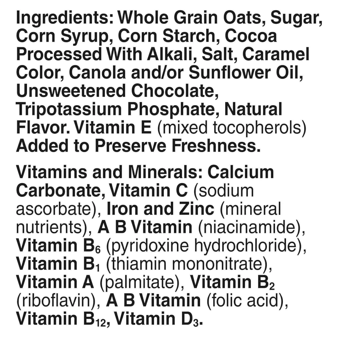 ingredients : شوفان كامل، سكر، شراب الذرة، نشا الذرة، كاكاو المعالج بالقلويات، ملح، لون الكراميل، زيت الكانولا و/أو زيت عباد الشمس، الشوكولاته غير المحلاة، فوسفات ثلاثي البوتاسيوم، نكهة طبيعية. فيتامين E (مزيج من التوكوفيرول) مضاف للحفاظ على النضارة. الفيتامينات والمعادن: كربونات الكالسيوم، فيتامين ج (أسكوربات الصوديوم)، حديد وزنك (العناصر الغذائية المعدنية)، فيتامين أ (نياسيناميد)، فيتامين ب6 (هيدروكلوريد البيريدوكسين)، فيتامين ب (أحادي نترات الثيامين)، فيتامين أ (بالميتات)، فيتامين ب2 (ريبوفلافين)، فيتامين أ (حمض الفوليك)، فيتامين ب12، فيتامين د3
