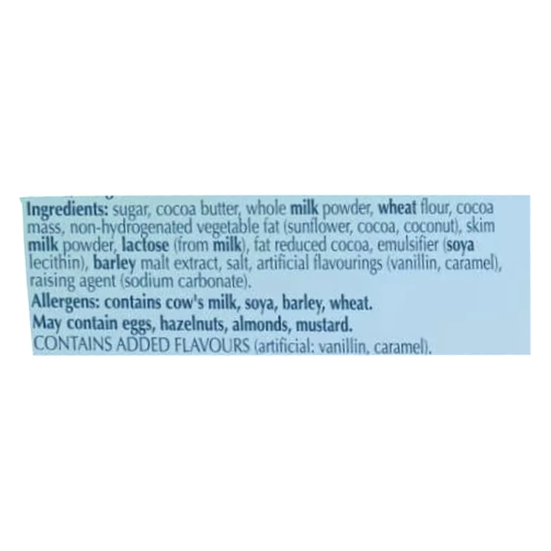ingredients : ويفر (13%) مع حشوة الشوكولاته (36%)، مغطاة بشوكولاته الحليب (51%)، 130 غرام. المكونات: سكر، زبدة الكاكاو، مسحوق حليب كامل الدسم، طحين قمح، كتلة كاكاو، دهون نباتية غير مهدرجة (دوار الشمس، كاكاو، جوز الهند)، مسحوق حليب خالي الدسم، لاكتوز (من الحليب)، كاكاو قليل الدسم، مستحلب (ليسيثين الصويا)، مستخلص الشعير، ملح، نكهات صناعية (فانيلين، كراميل)، عامل تخمير (كربونات الصوديوم).