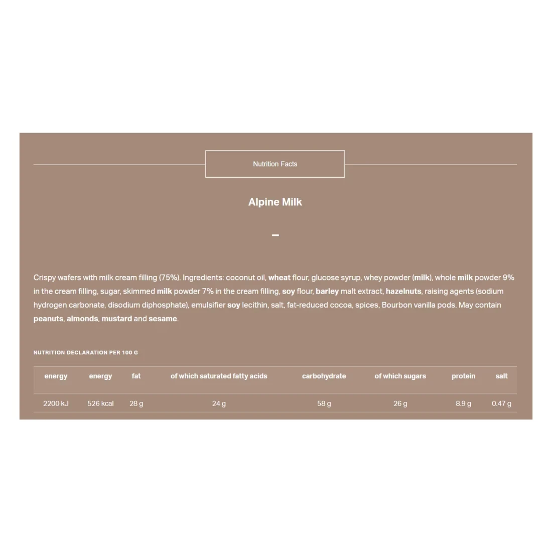 ingredients : زيت جوز الهند، دقيق القمح، شراب الجلوكوز، مسحوق مصل اللبن (حليب)، مسحوق حليب كامل الدسم 9% في حشوة الكريمة، سكر، مسحوق حليب خالي الدسم 7% في حشوة الكريمة، دقيق الصويا، مستخلص الشعير، بندق، عوامل رفع (كربونات الصوديوم، ثنائي فوسفات الصوديوم)، مستحلب ليسيثين الصويا، ملح، كاكاو قليل الدسم، توابل، قرون فانيليا بوربون