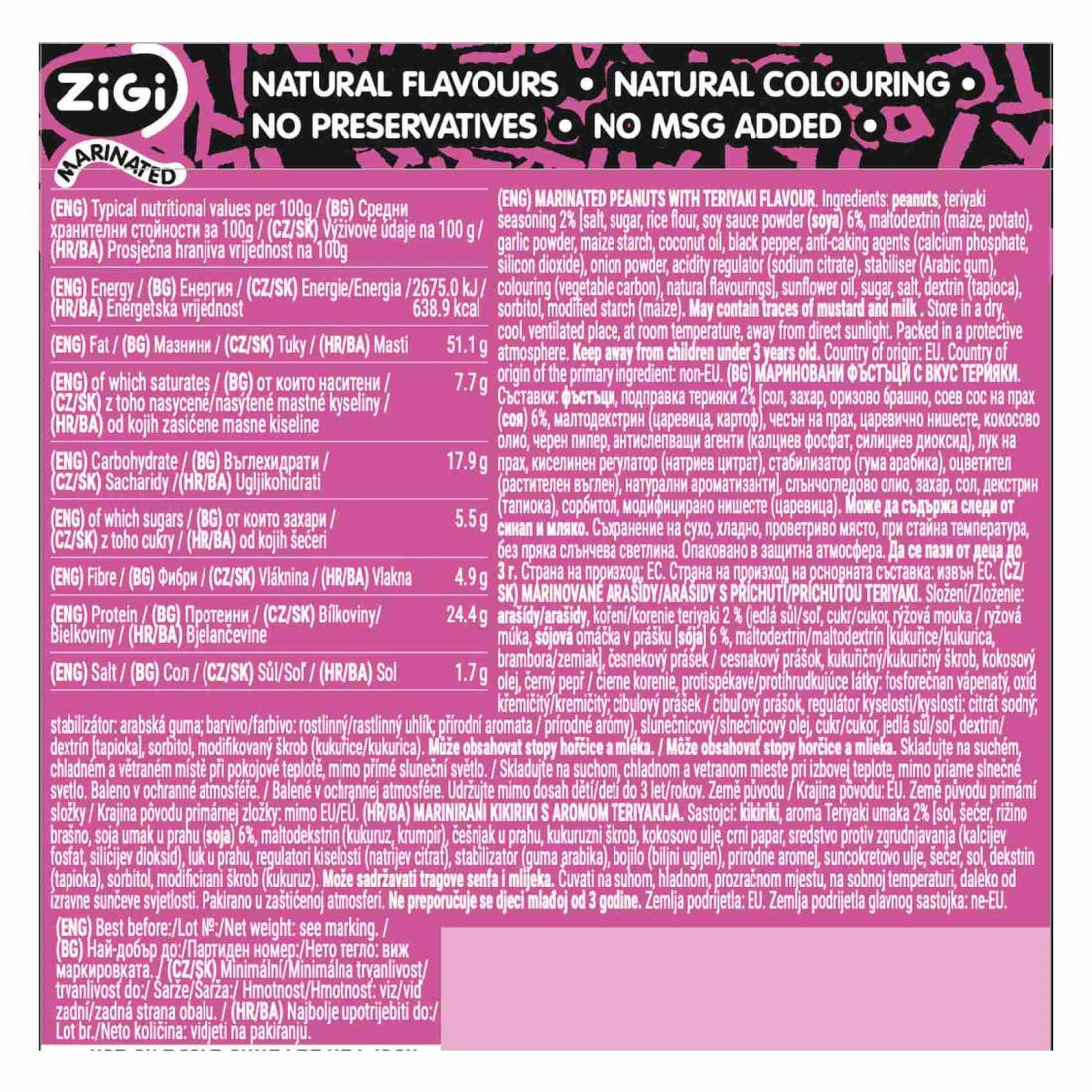 ingredients : فول سوداني، توابل ترياكي 2% (ملح، سكر، دقيق أرز، مسحوق صلصة الصويا (صويا) 6%، مالتوديكسترين (ذرة، بطاطس)، مسحوق ثوم، نشا ذرة، زيت جوز الهند، فلفل أسود، عوامل مضادة للتكتل (فوسفات الكالسيوم، ثاني أكسيد السيليكون)، مسحوق بصل، منظم حموضة (سترات الصوديوم)، مثبت (صمغ عربي)، ملون (كربون نباتي)، نكهات طبيعية)، زيت عباد الشمس، سكر، ملح، ديكسترين (تابيوكا)، سوربيتول، نشا معدل (ذرة)