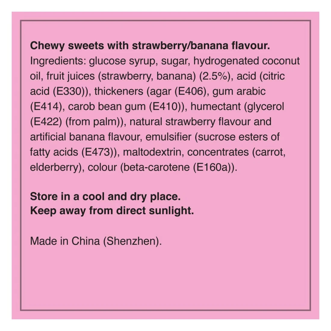 ingredients : شراب الجلوكوز، سكر، زيت جوز هند مهدرج، عصائر فواكه (فراولة، موز) (2.5%)، حمض (حمض الستريك (E330))، مواد مُكثِّفة (آجار (E406)، صمغ عربي (E414)، صمغ حبوب الخروب (E410))، مُرطِّب (جلسرين (E422) (من النخيل))، نكهة فراولة طبيعية ونكهة موز اصطناعية، مُستحلب (إسترات سكروز للأحماض الدهنية (E473))، مالتوديكسترين، مُركِّزات (جزر، بلسان أسود)، لون (بيتا كاروتين (E160a))