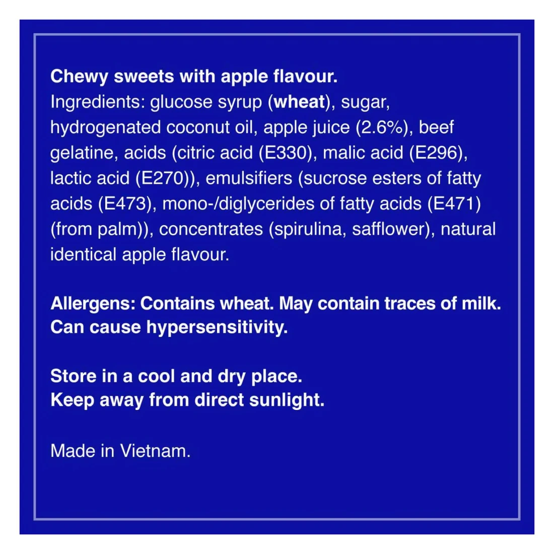 ingredients : شراب الجلوكوز (قمح)، سكر، زيت جوز هند مهدرج، عصير تفاح (2.6%)، جيلاتين لحم البقر، أحماض (حمض الستريك (E330)، حمض الماليك (E296)، حمض اللاكتيك (E270))، مستحلبات (إسترات السكروز للأحماض الدهنية (E473)، أحادي/ثنائي الجلسريد للأحماض الدهنية (E471) (من النخيل))، مركزات (سبيرولينا، قرطم)، نكهة تفاح طبيعية متطابقة