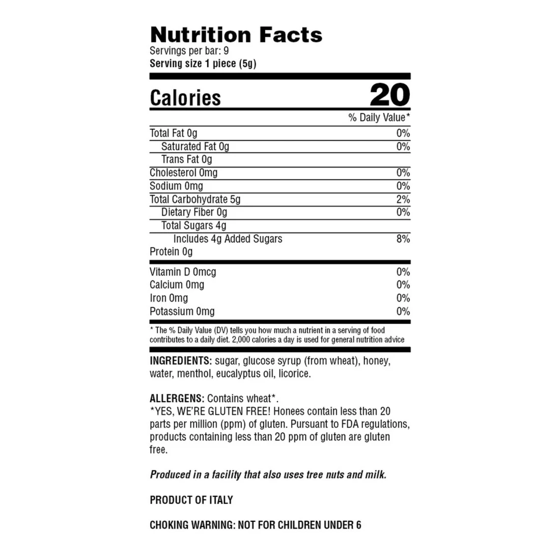ingredients : سكر، شراب الجلوكوز (من القمح)، عسل، ماء، نعناع، زيت اليوكاليبتوس، شعير