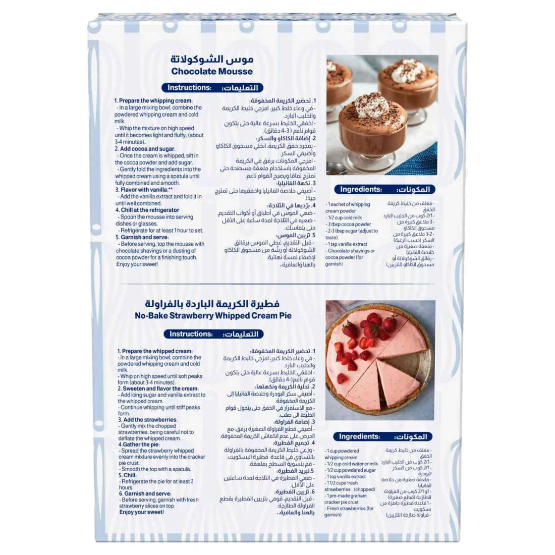 مزيج الكريمة المخفوقة بنكهة الفانيليا من المراعي هو منتج مريح ومتعدد الاستخدامات مصمم لصنع حشوات وحلويات مخفوقة لذيذة. يأتي هذا المزيج في عبوة بحجم 70 غرامًا، وهو سهل الاستخدام، ولا يتطلب سوى إضافة الماء البارد للحصول على قوام كريمي غني. بفضل نكهته اللذيذة بالفانيليا، فإنه يعزز مجموعة متنوعة من الحلويات، من الكعك والمعجنات إلى الآيس كريم والمشروبات. يعد مزيج الكريمة المخفوقة من المراعي مثاليًا لكل من الخبازين المنزليين وعشاق الطهي، حيث يوفر حلاً سريعًا وموثوقًا به لإضافة لمسة من الحلاوة والأناقة إلى أي طبق.