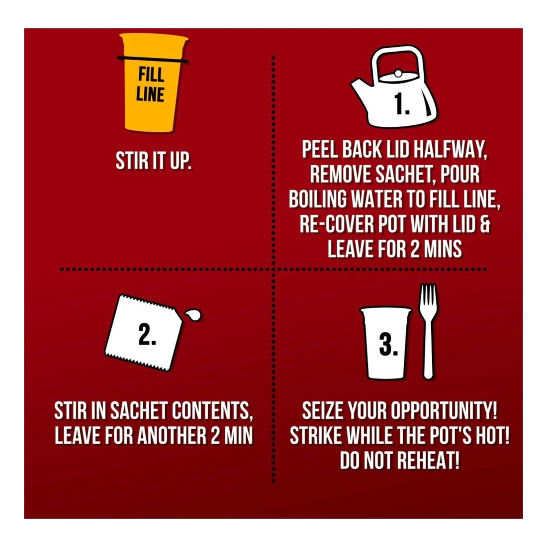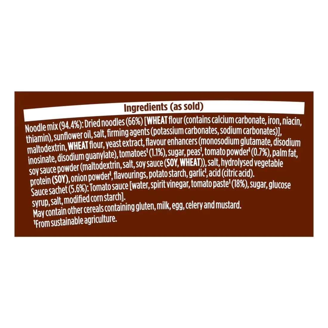 ingredients : خلطة النودلز (96%): نودلز مجففة (69%) [دقيق قمح (يحتوي على كربونات الكالسيوم، حديد، نياسين، ثيامين)، زيت نخيل، ملح، عوامل التصلب (كربونات البوتاسيوم، كربونات الصوديوم)]، سكر، نشا بطاطا، مالتوديكسترين، جزر، بازلاء، مسحوق تفاح، مسحوق طماطم، فلفل أحمر، مسحوق بصل، أحماض (حمض الستريك، حمض الطرطريك)، معززات النكهة (غلوتامات أحادي الصوديوم، إينوسينات ثنائي الصوديوم، غوانيلات ثنائي الصوديوم)، ملح، منظم حموضة (أسيتات الصوديوم)، نكهات، دهن نخيل، مسحوق ثوم، زنجبيل، كركم، صلصة الصويا (فول الصويا، قمح)، مثبت (فوسفات الكالسيوم).كيس الصلصة (4%): صلصة حلوة وحامضة [ماء، سكر، خل مالت الشعير، معجون طماطم، نشا ذرة معدّل، ملح، بصل، حمض (حمض الستريك)، صلصة الصويا (ماء، ملح، سكر، خل مالت الشعير، مستخلص مالت الشعير، فول الصويا)، مركز عصير ليمون، مستخلص زنجبيل].