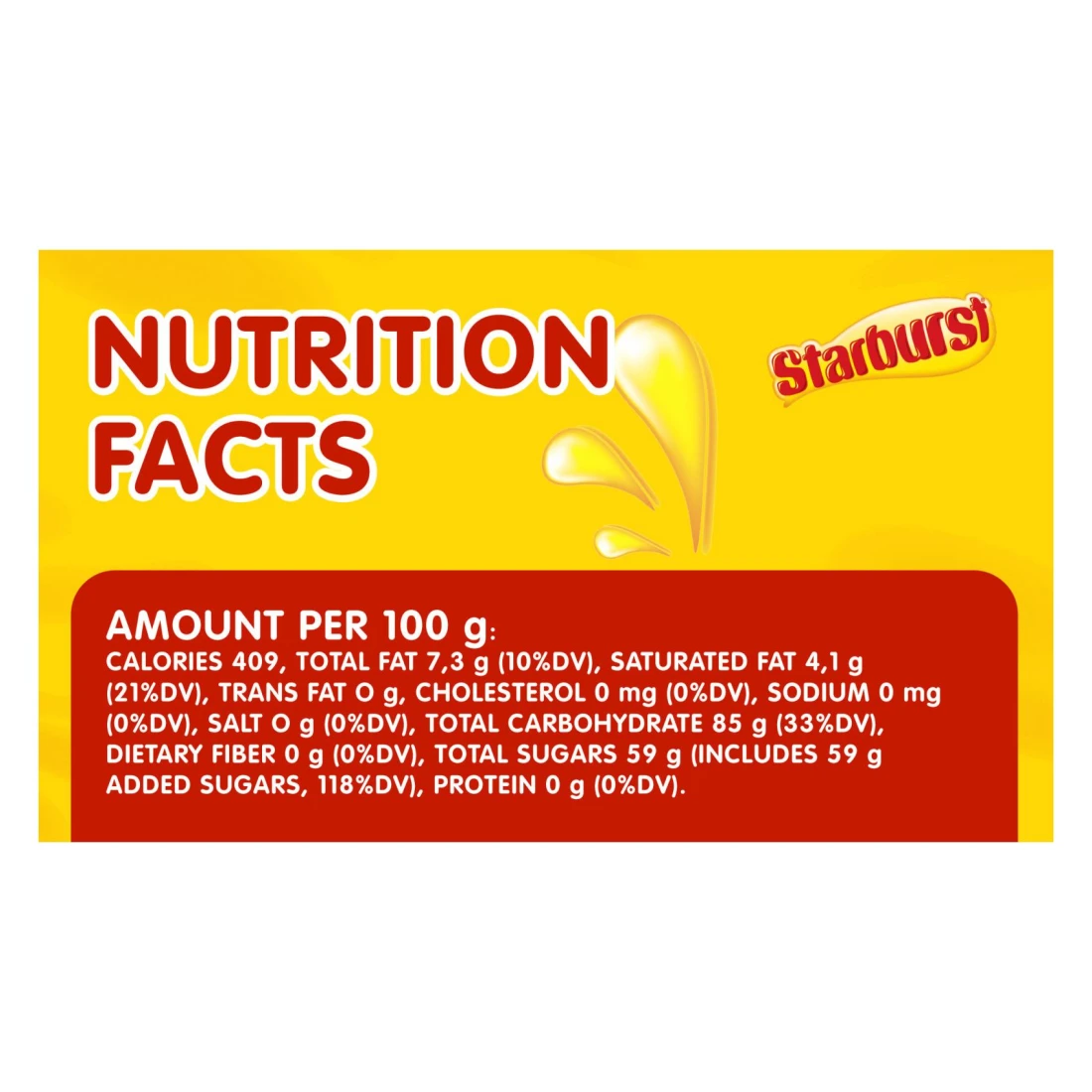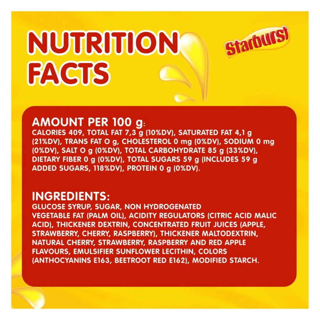 ingredients : شراب الغلوكوز، سكر، دهون نباتية غير مهدرجة (زيت النخيل)، منظمات حموضة (حمض الستريك، حمض الماليك)، دكسترين مكثف، عصائر فواكه مركزة (تفاح، فراولة، كرز، توت العليق)، مالتوديكسترين مكثف، نكهات الكرز الطبيعي، الفراولة، التوت، والتفاح الأحمر، مستحلب ليسيثين دوار الشمس، ألوان (أنثوسيانين E163، أحمر الشمندر E162)، نشا معدل