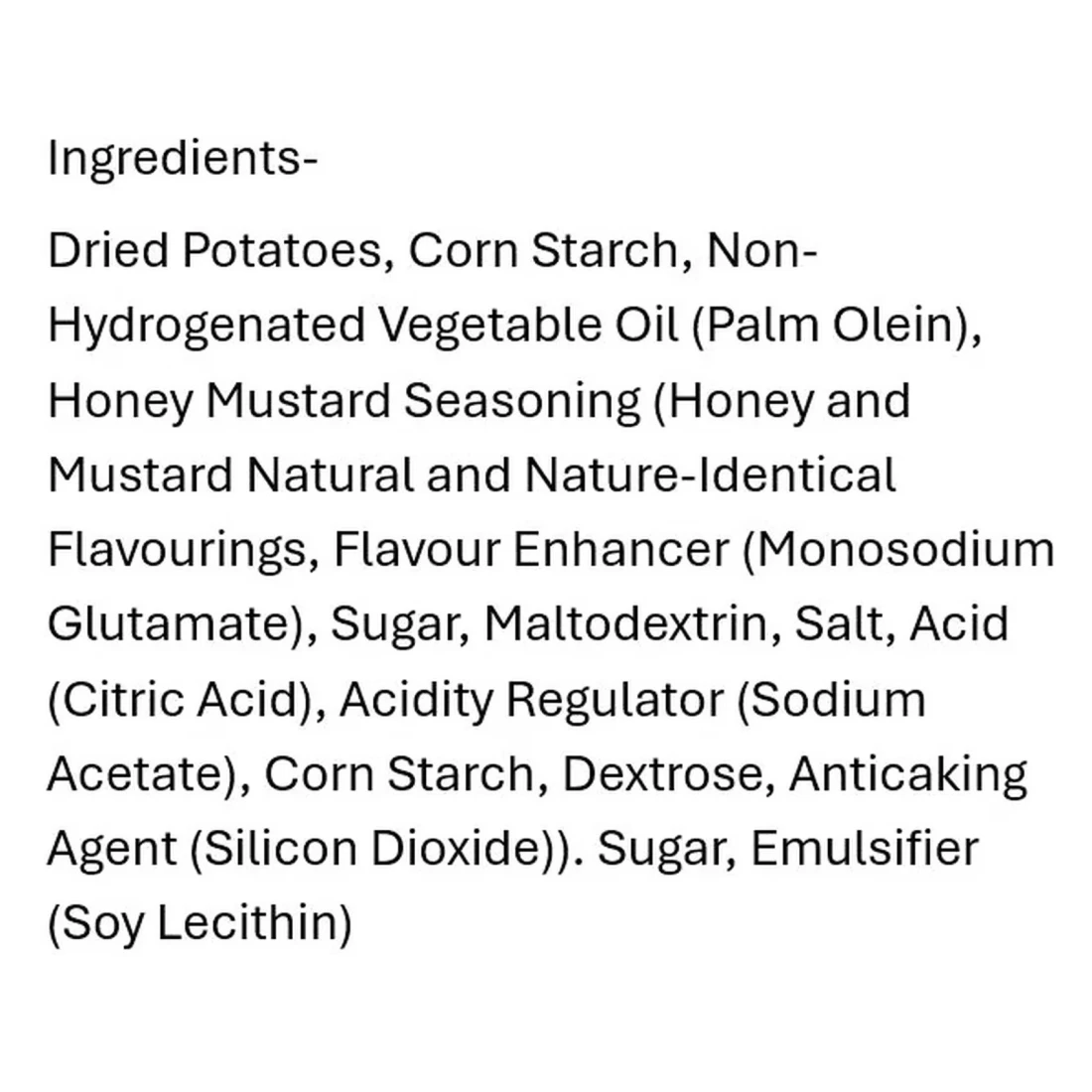 ingredients : بطاطس مجففة، نشا ذرة، زيت نباتي غير مهدرج (زيت النخيل)، توابل خردل بالعسل (نكهات العسل والخردل الطبيعية والمماثلة للطبيعية، مُحسِّن نكهة (غلوتامات أحادية الصوديوم)، سكر، مالتوديكسترين، ملح، حمض (حمض الستريك)، منظم حموضة (أسيتات الصوديوم)، نشا ذرة، دكستروز، عامل مضاد للتكتل (ثاني أكسيد السيليكون)). سكر، مستحلب (ليسيثين الصويا).