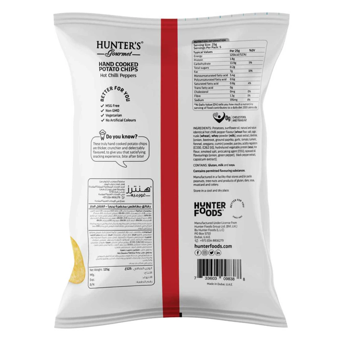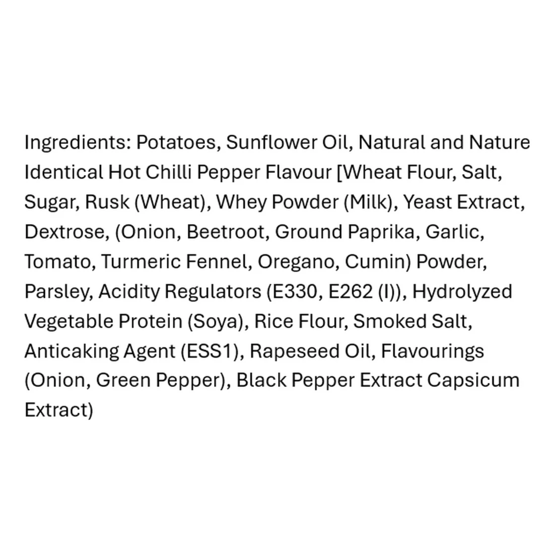 ingredients : بطاطا، زيت دوار الشمس، نكهة الفلفل الحار الحار الطبيعية والمتطابقة مع الطبيعة [دقيق القمح، ملح، سكر، فتات خبز (قمح)، مسحوق مصل الحليب (حليب)، خلاصة الخميرة، ديكستروز، (بصل، شمندر، بابريكا مطحونة، ثوم، طماطم، كركم، شمر، أوريغانو، كمون)، بقدونس، منظمات حموضة (E330، E262(I))، بروتين نباتي محلل (صويا)، دقيق الأرز، ملح مدخن، عامل مانع للتكتل (E551)، زيت اللفت، نكهات (بصل، فلفل أخضر)، مستخلص الفلفل الأسود، مستخلص الفليفلة]