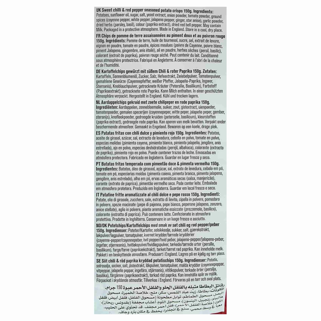 ingredients : بطاطس، زيت دوار الشمس، سكر، ملح، مستخلص الخميرة، مسحوق البصل، مسحوق الطماطم، أعشاب مطحونة (فلفل حريف، فلفل أبيض، فلفل هالبينو، زنجبيل، يانسون نجمي)، مسحوق الثوم، أعشاب مجففة (بقدونس، ريحان)، لون (مستخلص البابريكا)، فلفل أحمر حلو مجفف.