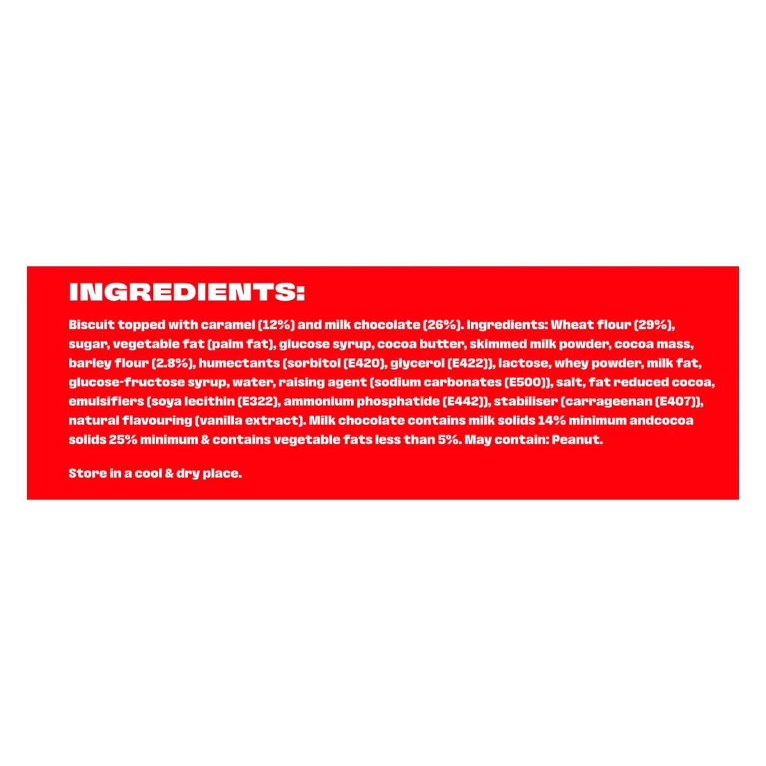 ingredients : دقيق القمح (29%)، سكر، دهن نباتي (دهن النخيل)، شراب الغلوكوز، زبدة الكاكاو، مسحوق حليب خالي الدسم، كتلة الكاكاو، دقيق الشعير (2.8%)، مرطبات (سوربيتول (E420)، غلسرين (E422))، لاكتوز، مسحوق مصل اللبن، دهن الحليب، شراب الغلوكوز والفركتوز، ماء، عامل رفع (كربونات الصوديوم (E500))، ملح، كاكاو قليل الدسم، مستحلبات (ليسيثين الصويا (E322)، فوسفاتيد الأمونيوم (E442))، مثبت (كاراجينان (E407))، نكهة طبيعية (مستخلص الفانيليا)