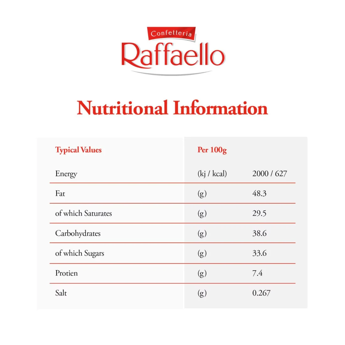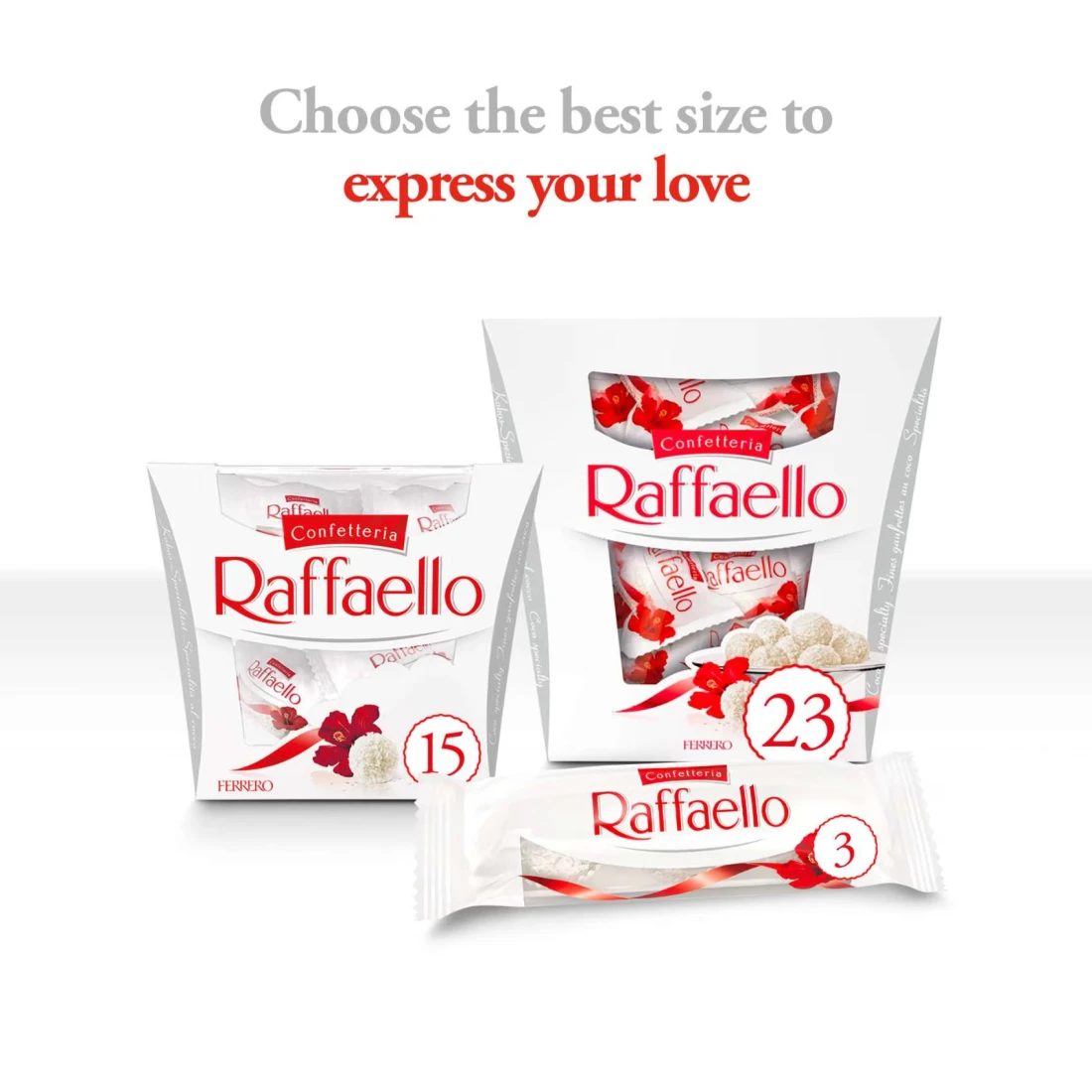 صُنع بحبٍّ، وللحب. رافايلو متعةٌ خالصةٌ تُرضي جميع الحواس، بلوزته الكاملة المقرمشة، المُغلّفة بحشوةٍ كريميّةٍ مخمليّة، ومُغلّفةٍ بقشرةٍ مقرمشةٍ من الويفر، ومُزيّنةٍ برقائق جوز الهند. أضف لمسةً غير متوقعةٍ من الحبّ والعاطفة إلى شخصٍ عزيزٍ على قلبك اليوم.