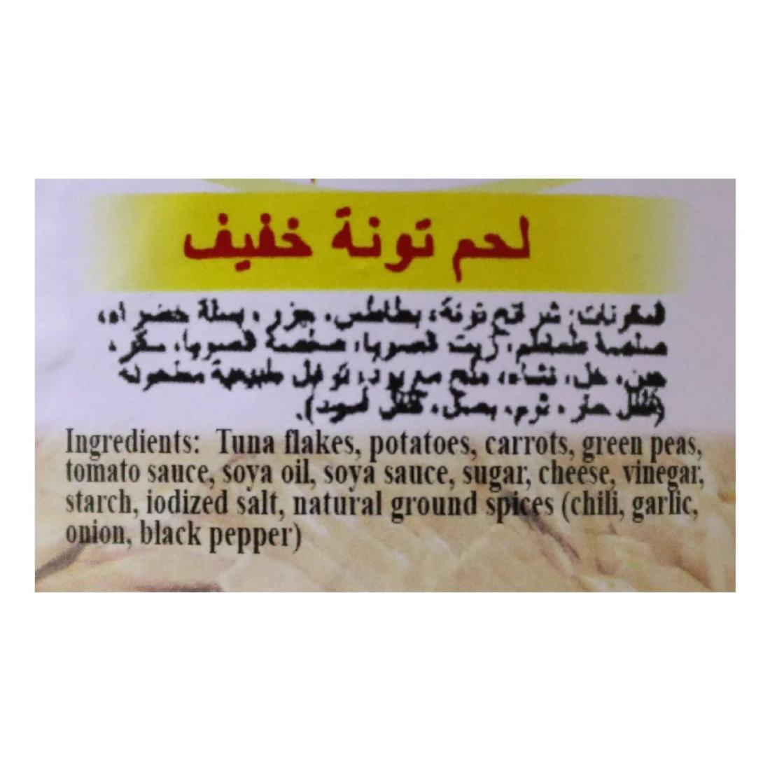 ingredients : قطع التونة، صلصة الطماطم، بطاطس، جزر، بازلاء خضراء، زيت الصويا، سكر، صلصة الصويا، مركز بروتين الصويا، توابل، جبن، ملح، خل، نشاء وتوابل.