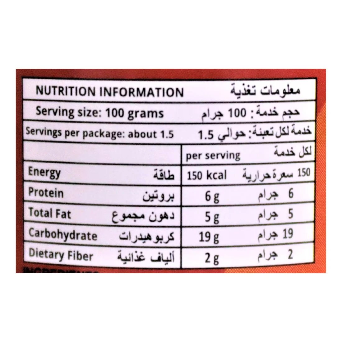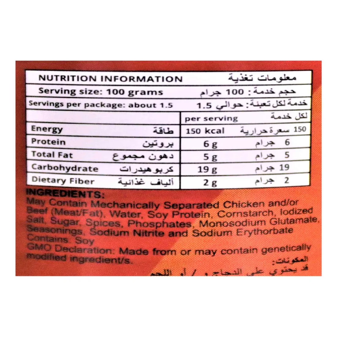 ingredients : لحم بقري ، ماء ، بروتين الصويا ، نشا الذرة ، ملح معالج باليود ، سكر ، بهارات ، فوسفات ، غلوتامات أحادي الصوديوم ، توابل ، نتريت الصوديوم ، إريثوربات الصوديوم