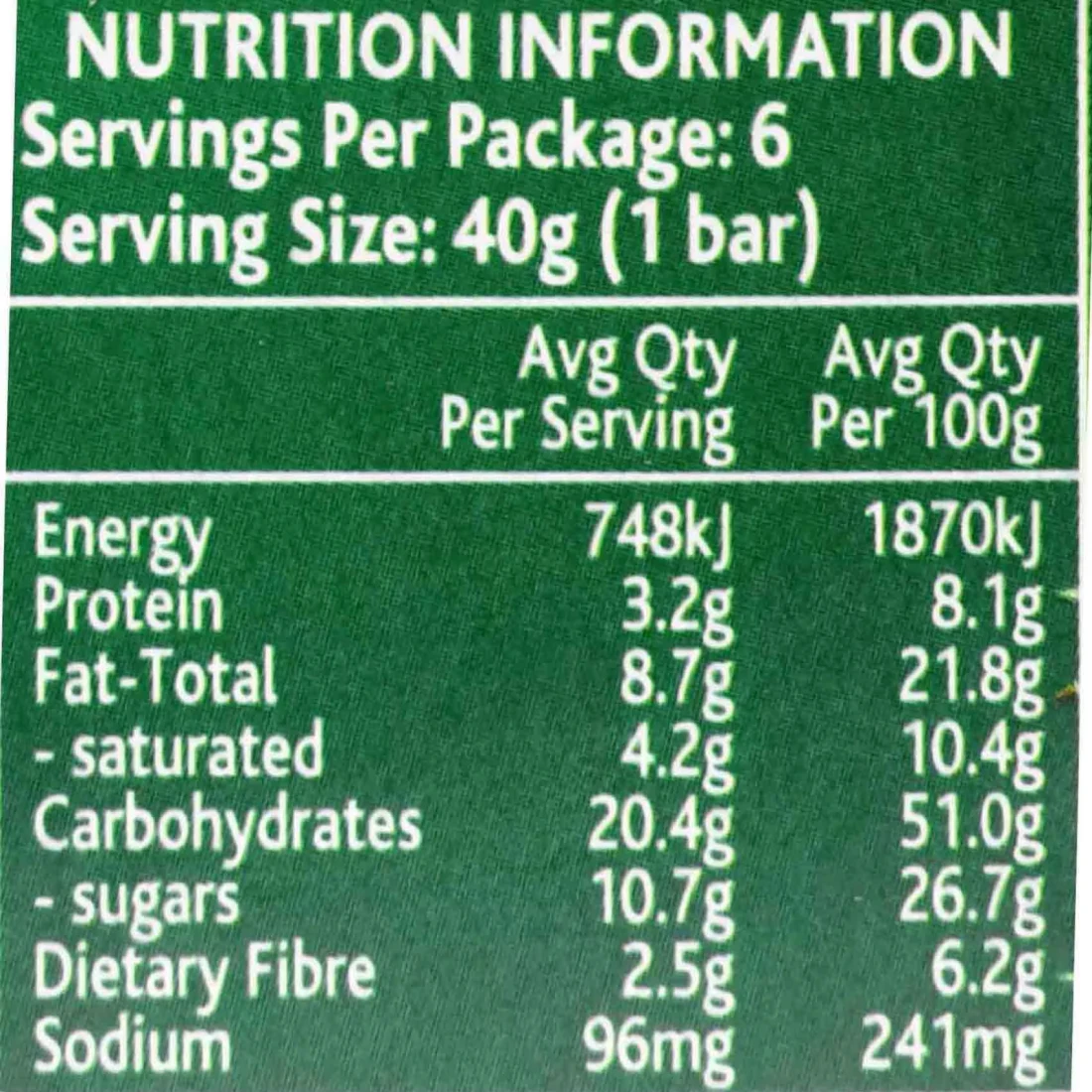 ingredients : حبوب كاملة (27%) (شوفان كامل (94%)، دقيق قمح كامل)، سكر مقلوب، شوكولاطة داكنة (12%) (سكر، كتلة كاكاو، زبدة كاكاو، مسحوق كاكاو، دهن حليب خالي من الماء، مستحلبات (ليسيثين الصويا، 476)، نكهة طبيعية)، زبدة (14%) (كريمة (حليب))، سكر بني، رقائق ذرة (7%) (ذرة (89%)، سكر، ملح، مستخلص شعير، فيتامينات (نياسين، ثيامين، ريبوفلافين، فولات)، معدن (حديد))، طحين قمح، جوز (6%)، مسحوق كاكاو (4%)، مسحوق بيض كامل، عوامل رافعة (450، 500).