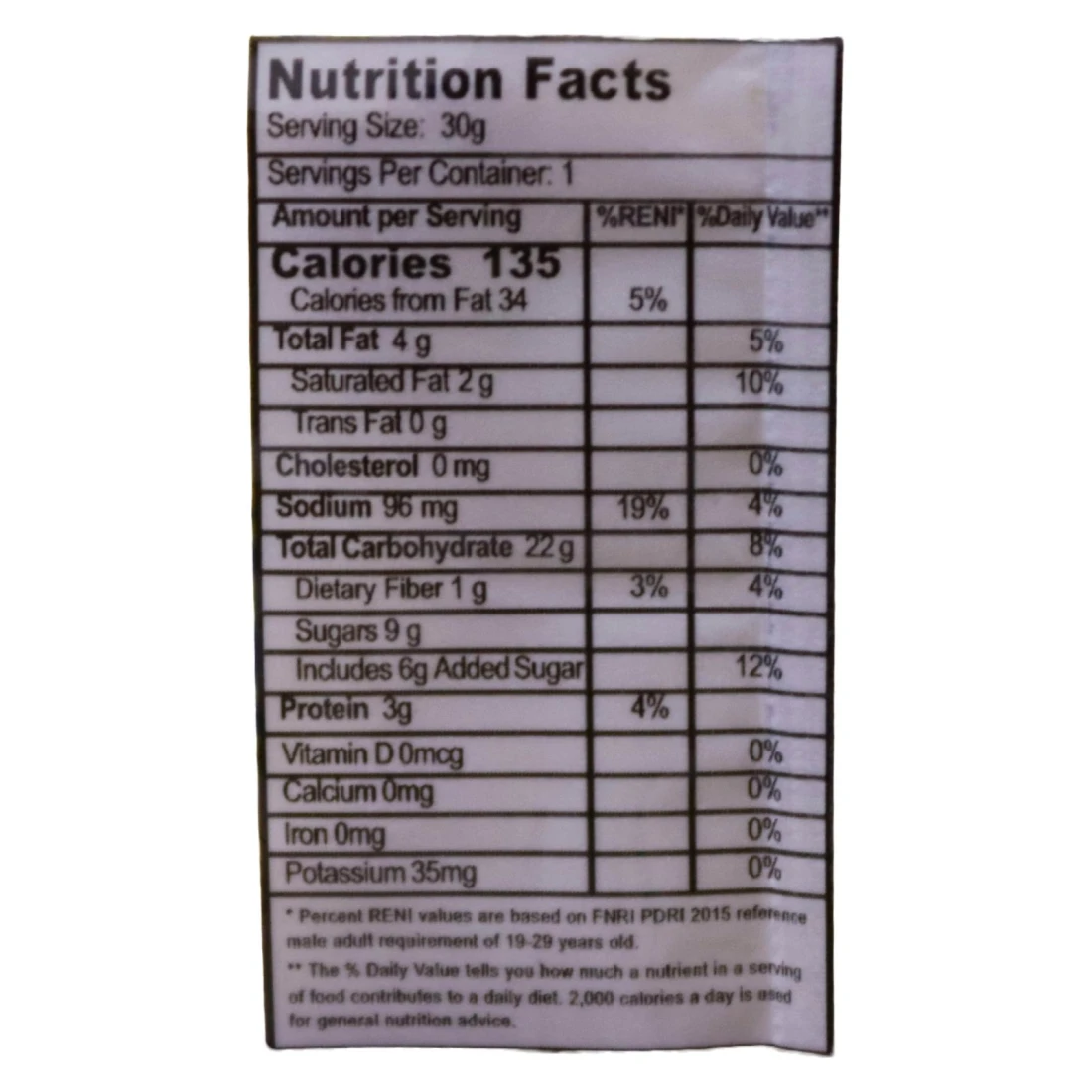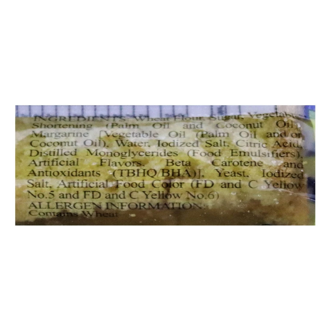 ingredients : دقيق القمح المخصب (دقيق القمح (يحتوي على الجلوتين) ، نياسين ، حديد ، ثيامين ، لون (ريبوفلافين)) (47٪) ، سكر ، دهن نباتي (زيت جوز الهند المهدرج جزئيًا وزيت جوز الهند) ، مارغرين (زيت جوز الهند وزيت النخيل وماء وملح ومستحلب (E471) ، نكهة ، لون (بيتا كاروتين)) (4٪) ، خميرة ، ملح معالج باليود (ملح ، يود) ، ألوان (E102 ، E100)