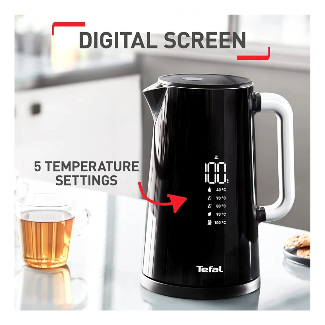 - Features a seamless minimalist digital screen that shows the real temperature of the water inside the kettle and offers a range of five temperature settings from 40°C up to 100°C - perfect for heating water to the perfect temperature depending on your drink